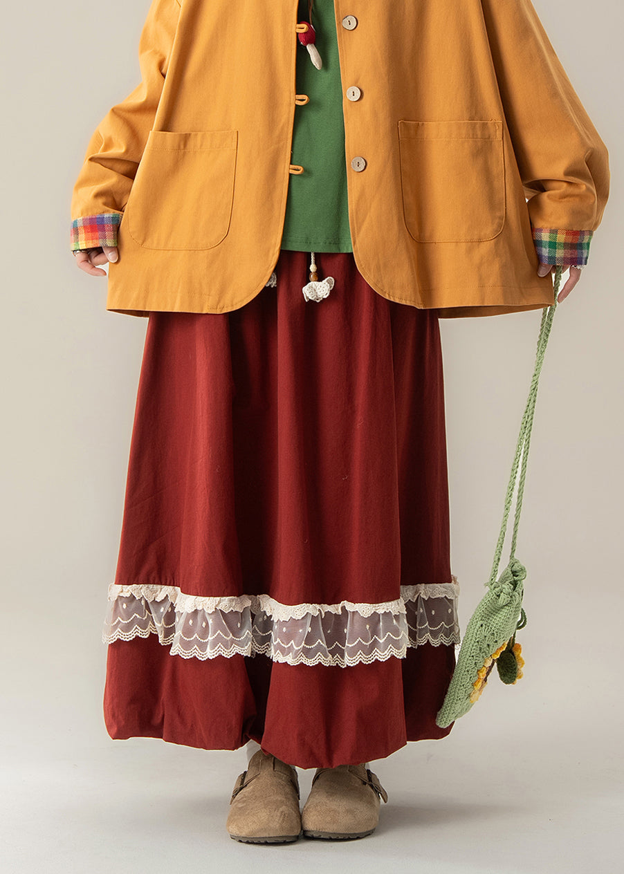 Simple Red Elastic Waist Patchwork Lace Holiday Skirt Spring
