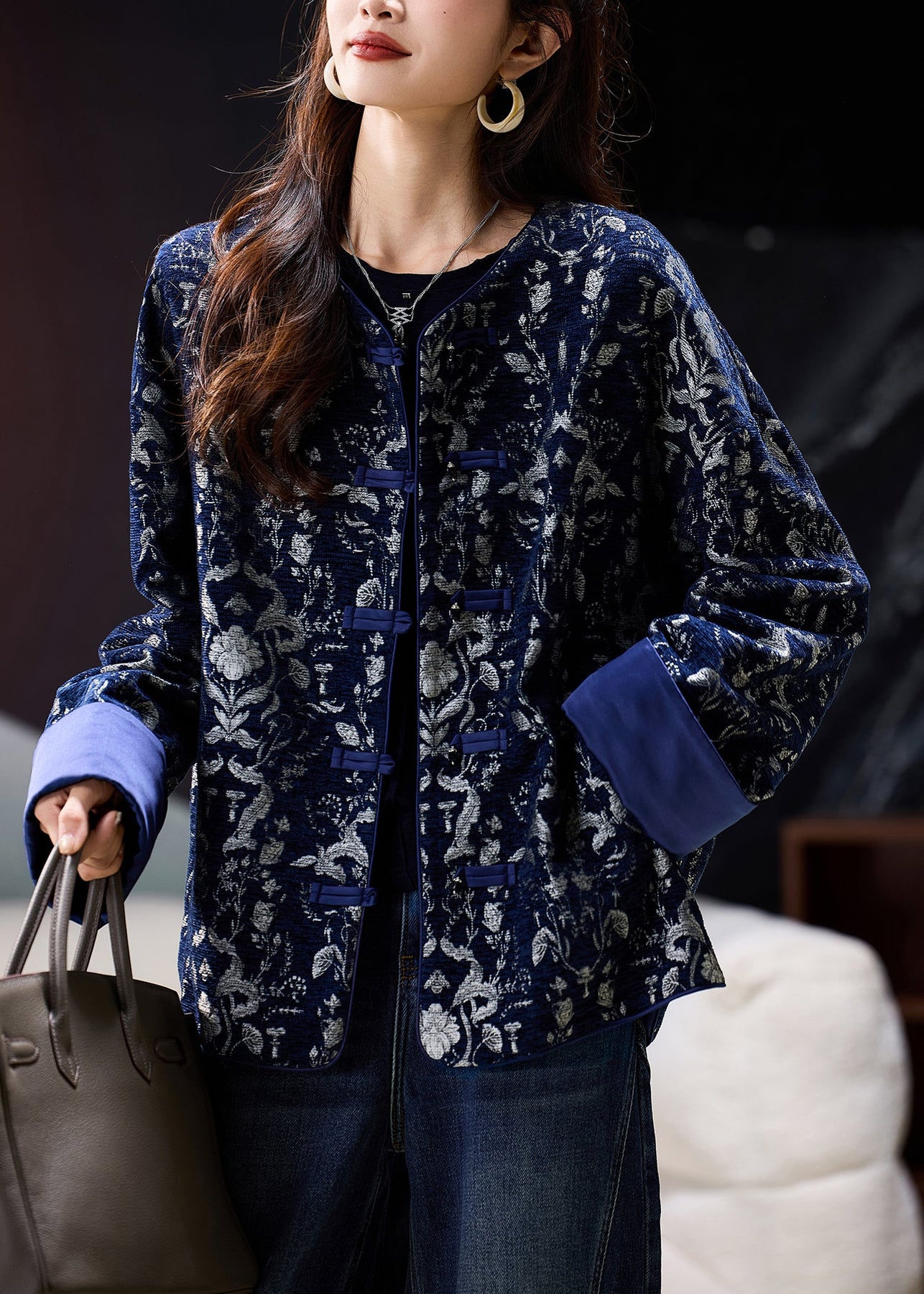 Plus Size Blue O Neck Jacquard Oriental Button Cotton Coat Spring