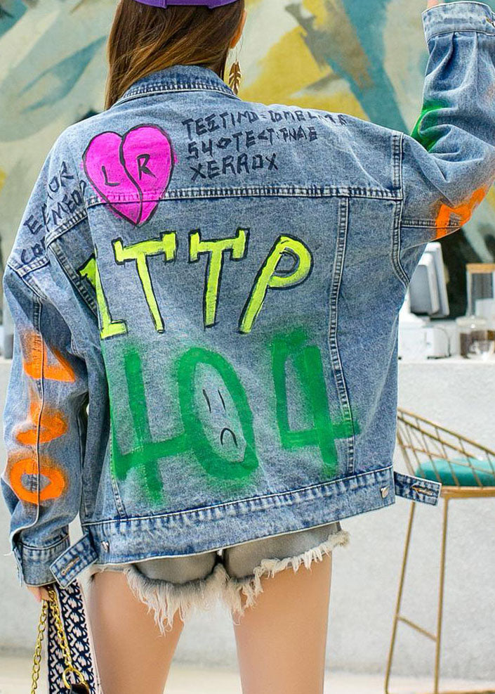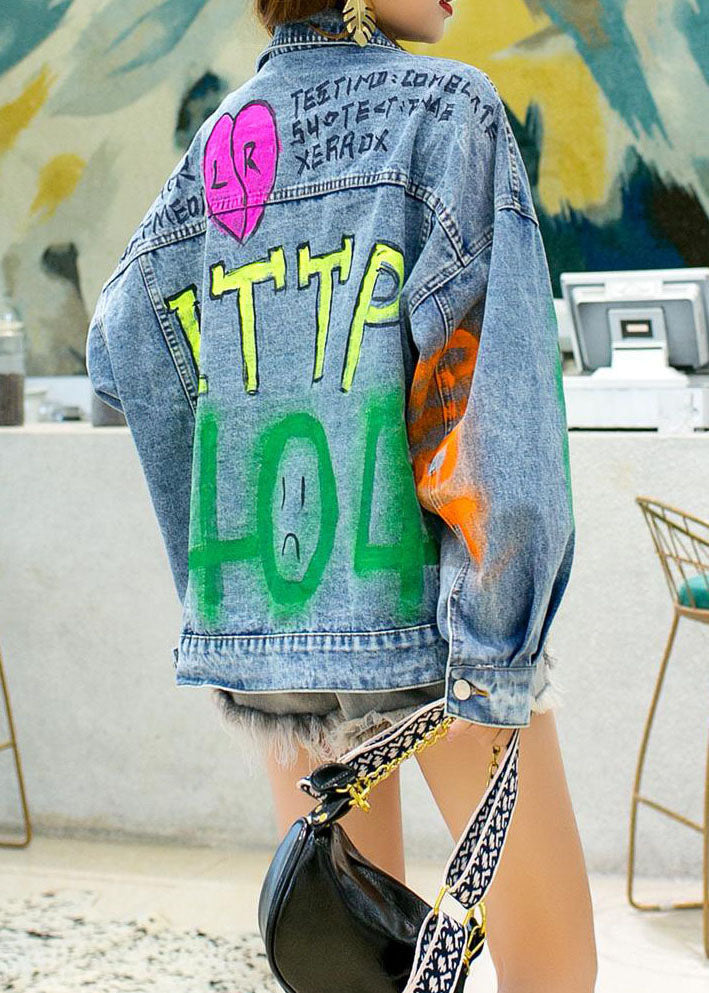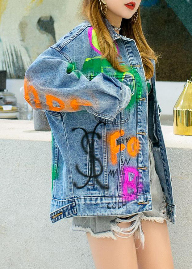 Streetwear Blue Peter Pan Collar Pockets Graphic Patchwork Cotton Coats Spring