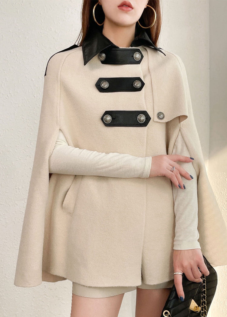 Style Beige Peter Pan Collar Faux Leather Patchwork Woolen Coats Cloak Sleeves