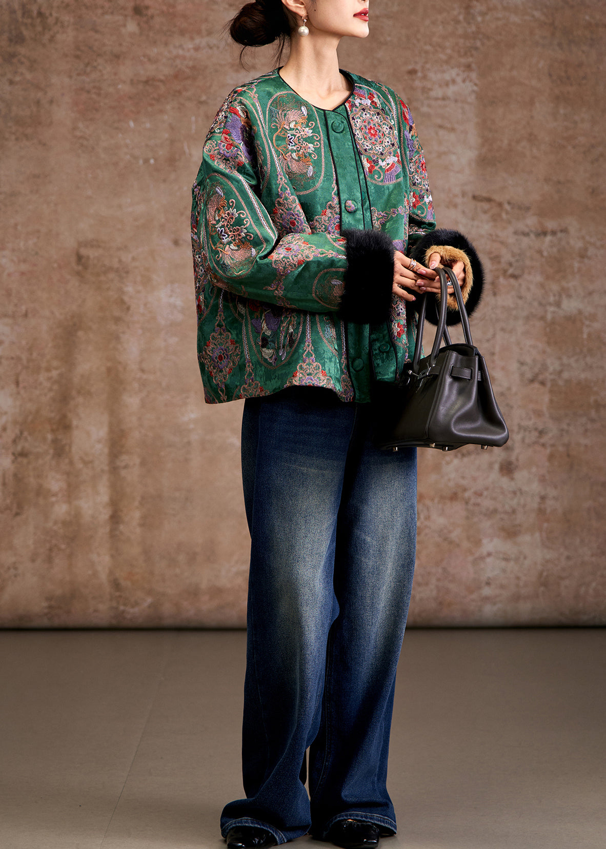 Beautiful Green Embroidered Patchwork Mink Hair Fine Cotton Filled Coats Winter