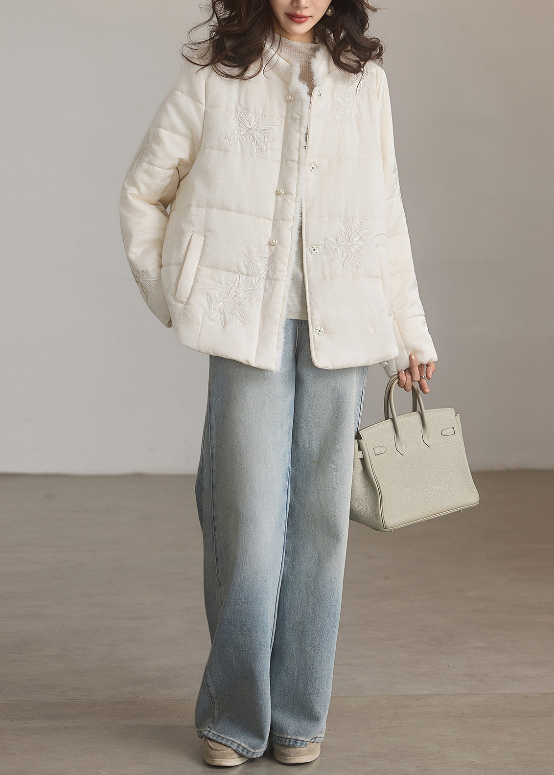 Modern Beige Embroidered Pockets Fine Cotton Filled Linen Coat Winter