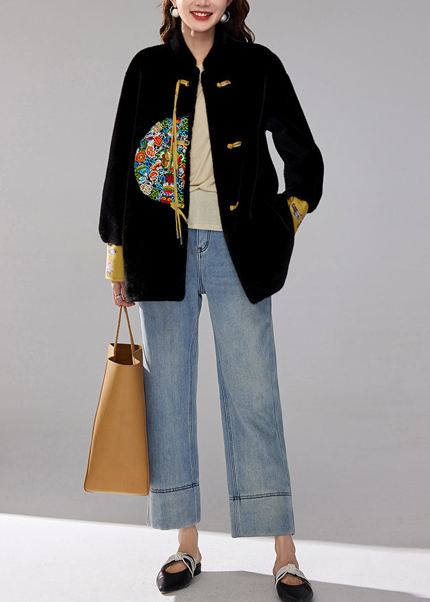 Vintage Black Embroidered Tasseled Faux Mink Velvet Coats Winter