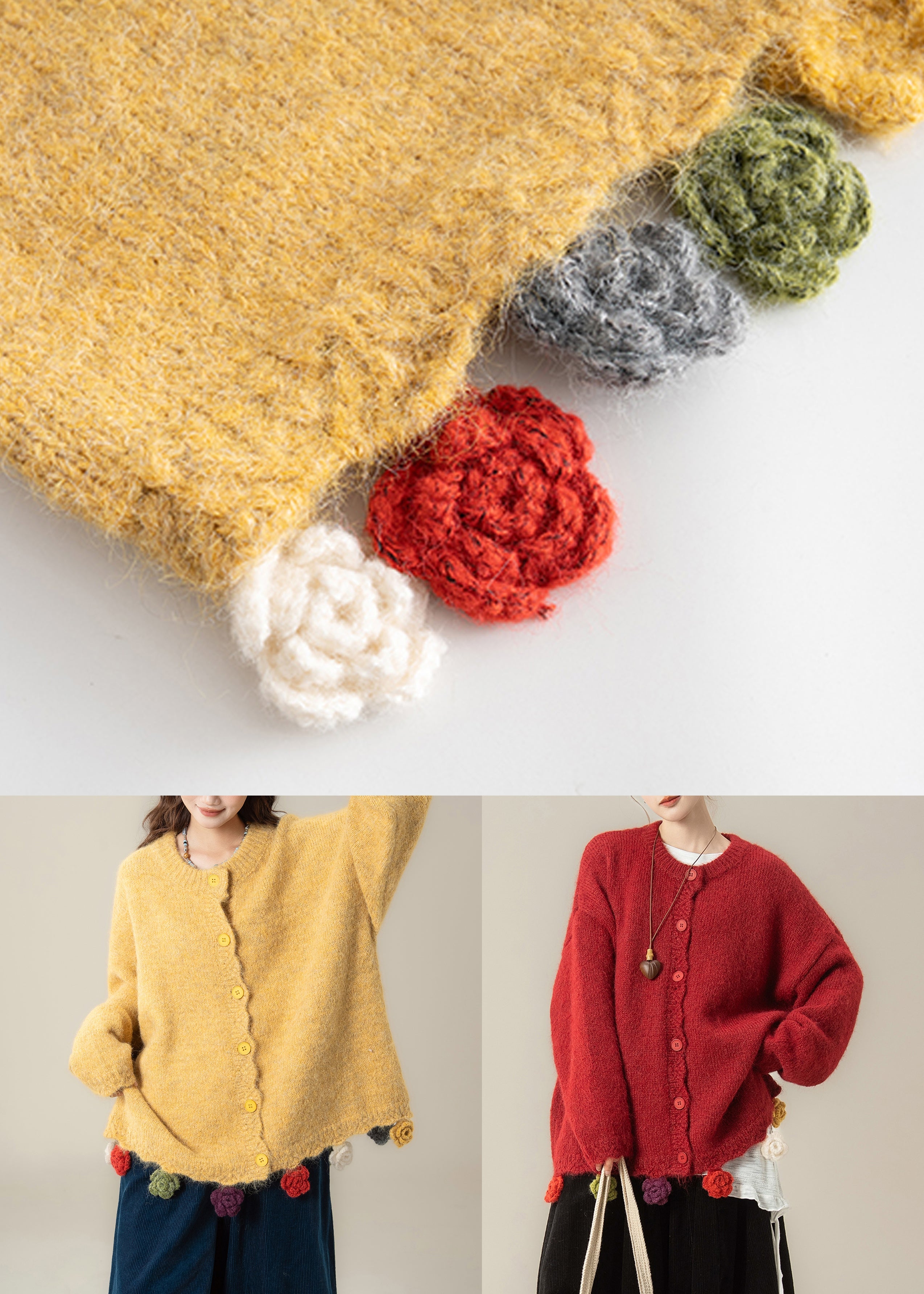 Yellow Floral Button Cozy Knit Coat O Neck Batwing Sleeve