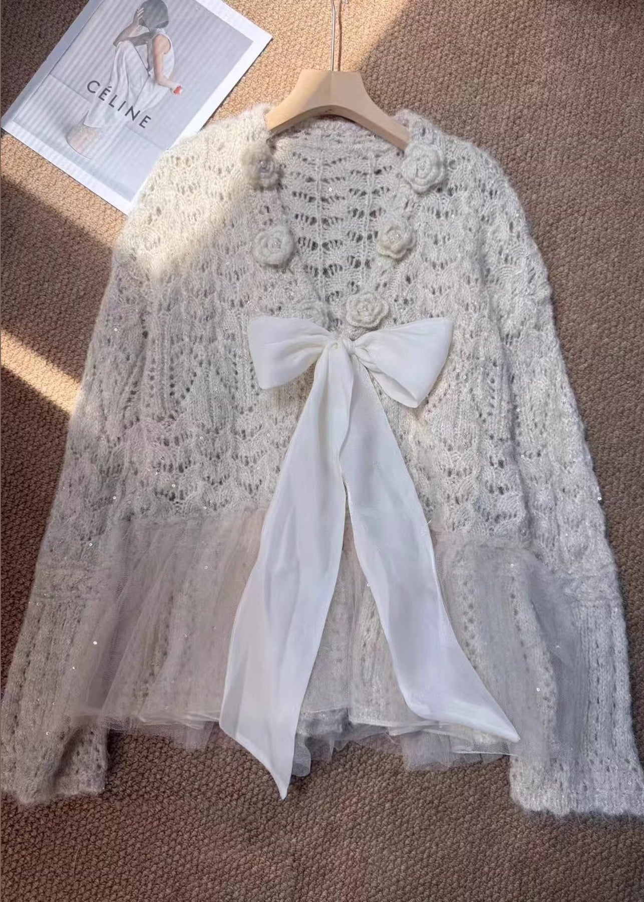 Fitted Beige Sequins Patchwork Bow Knit Cardigans Spring