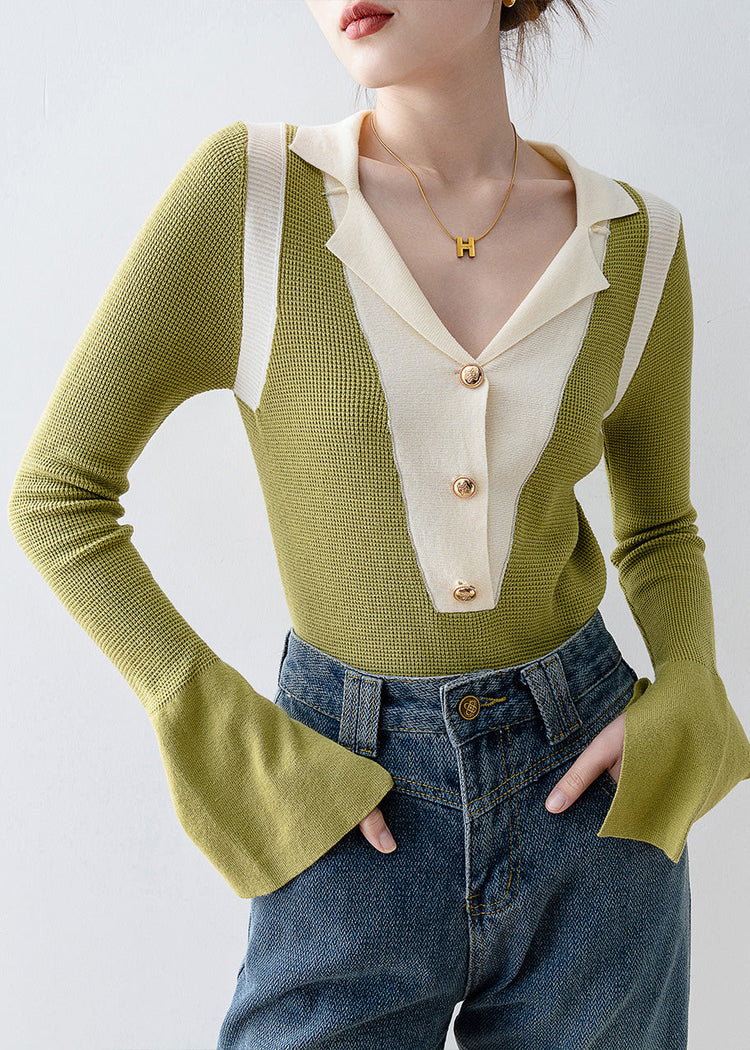 Italian Green V Neck Patchwork Knit Top Flare Sleeve