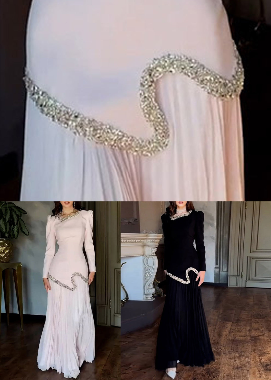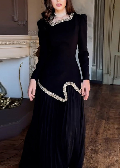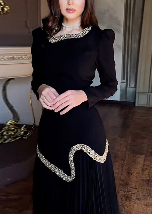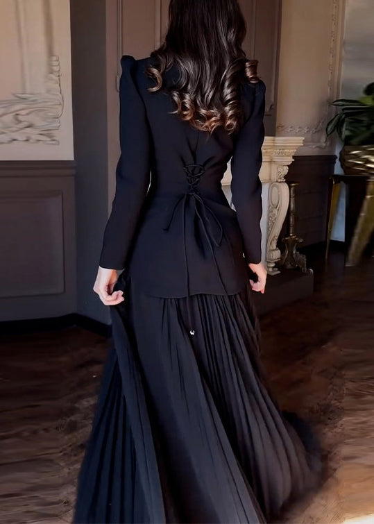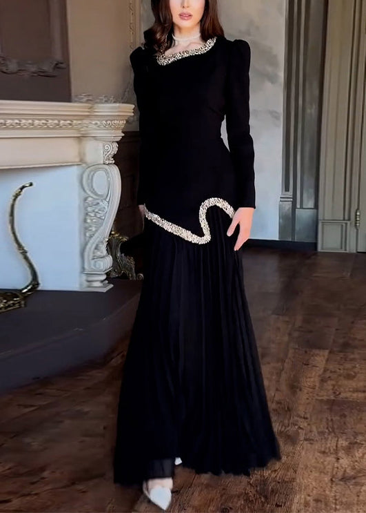 Black Wrinkled Tie Waist Chiffon Two Pieces Set Nail Bead Spring