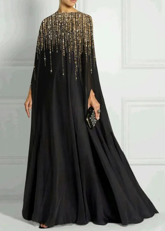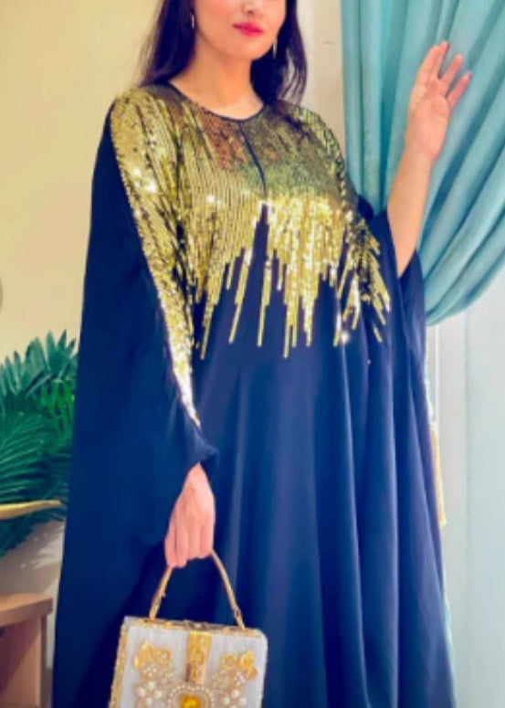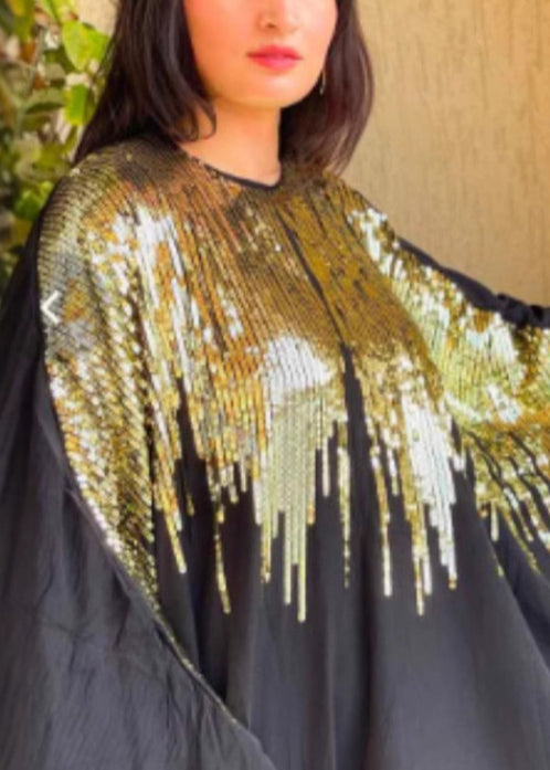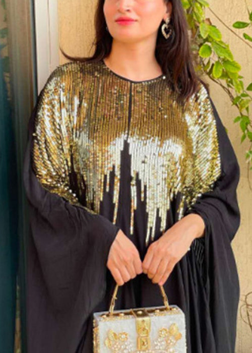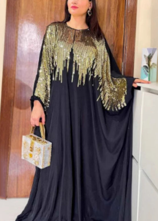 Classy Black Sequins Patchwork Cotton Maxi Dress Batwing Sleeve