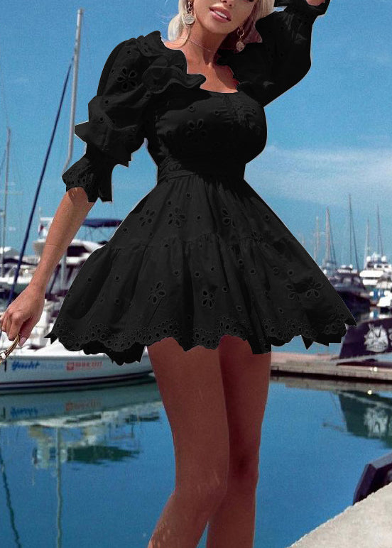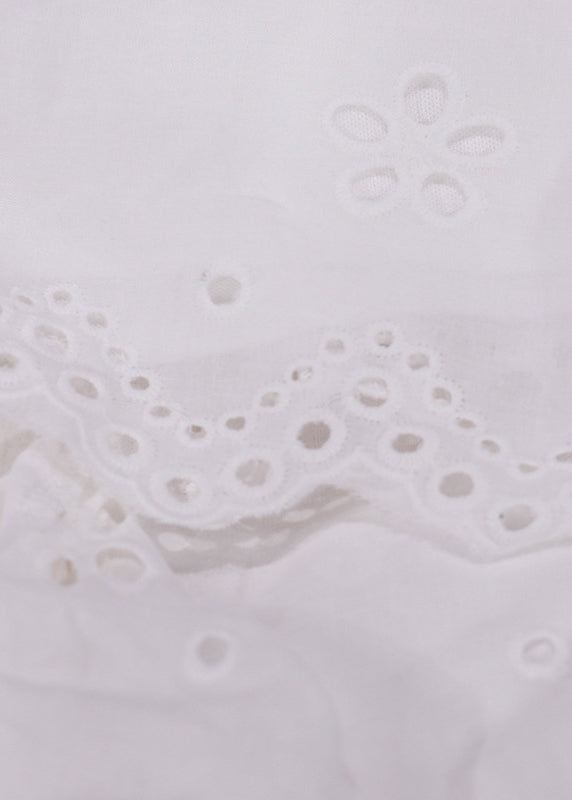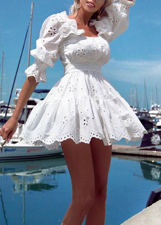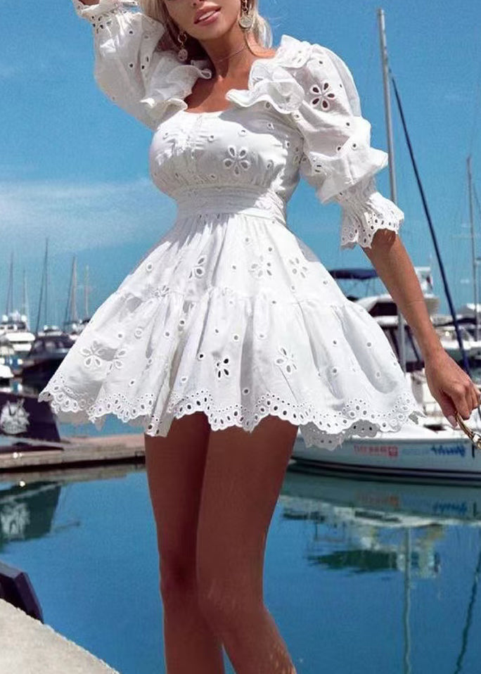 Classy White Ruffled Hollow Out Cotton Mini Dresses Half Sleeve