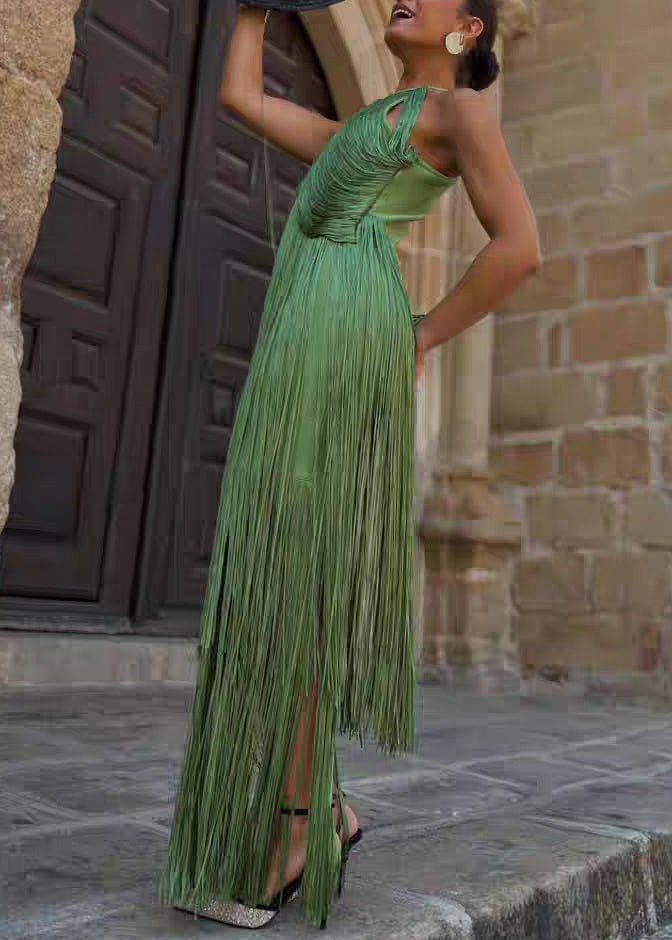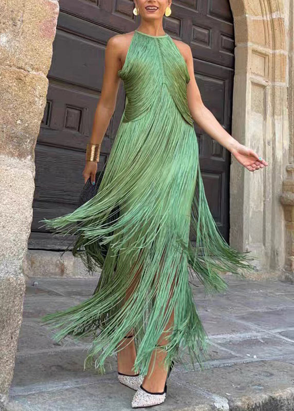 Elegant Green Tassel Patchwork Maxi Spaghetti Strap Dress Sleeveless