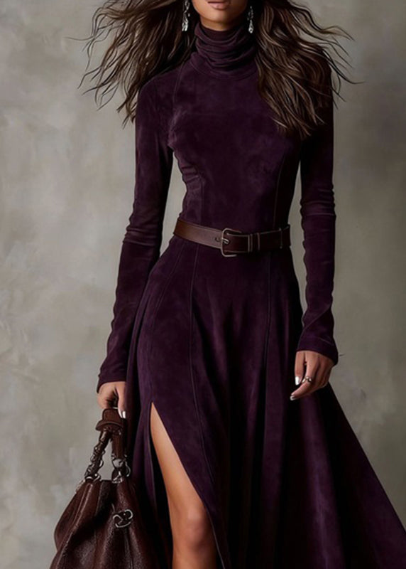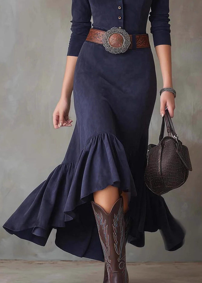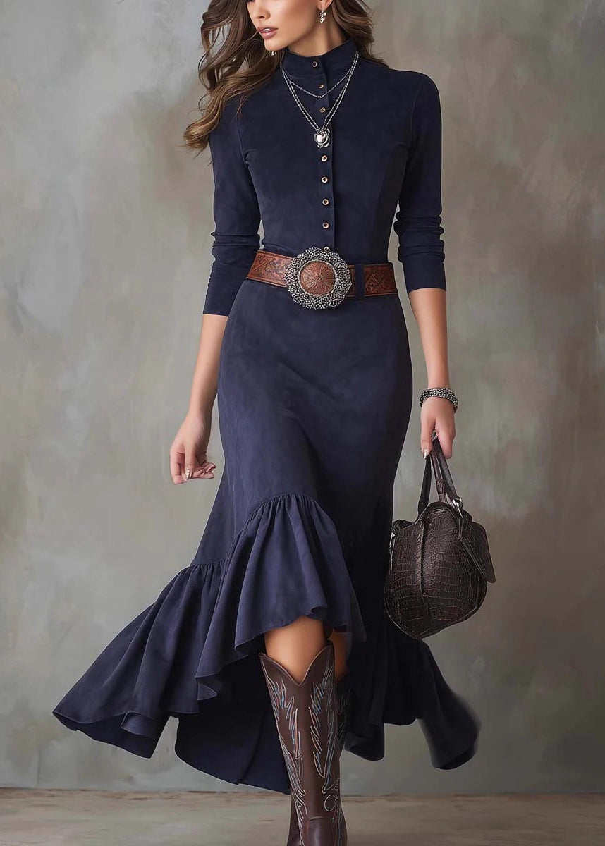 French Navy Wrinkled Button Solid Faux Suede Long Dress Spring