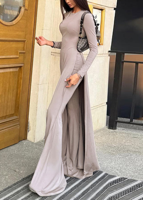 Grey Side Open Solid Cotton Two Pieces Set Spring O Neck