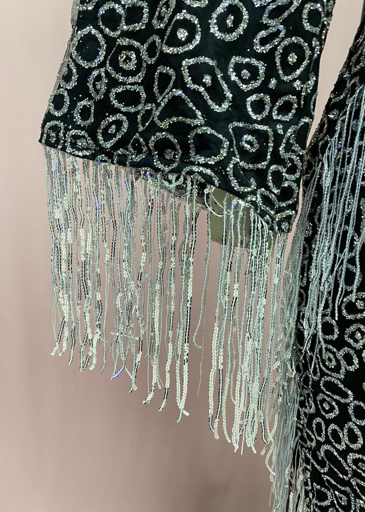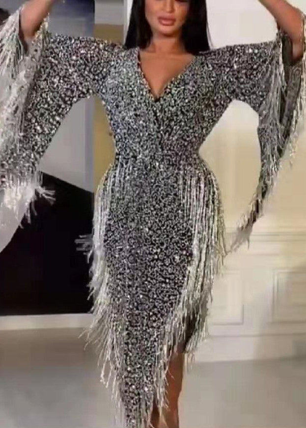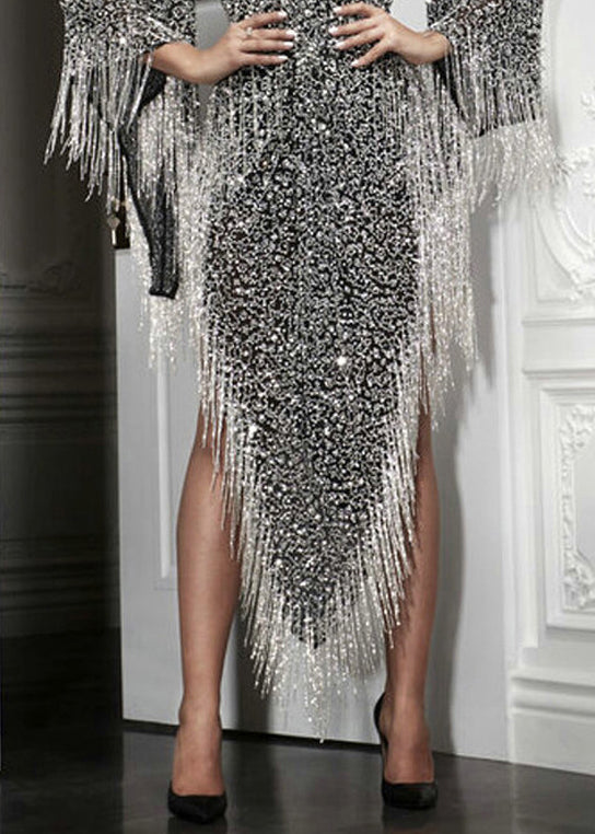 Handmade Silver Asymmetrical Tasseled Sequins Party Dress Batwing Sleeve