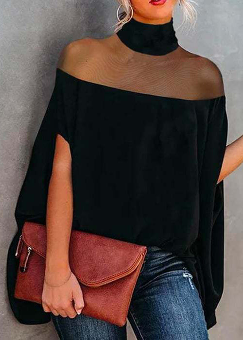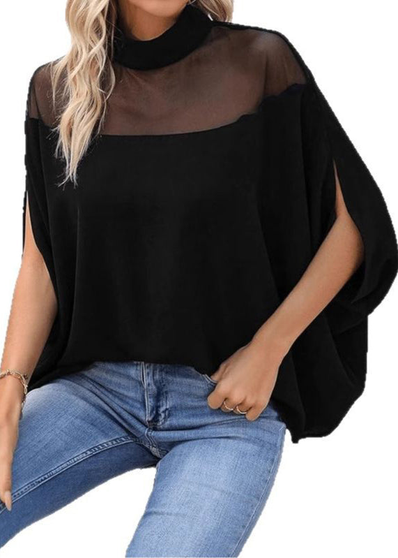 Loose Black Turtleneck Solid Tulle Patchwork T Shirts Batwing Sleeve