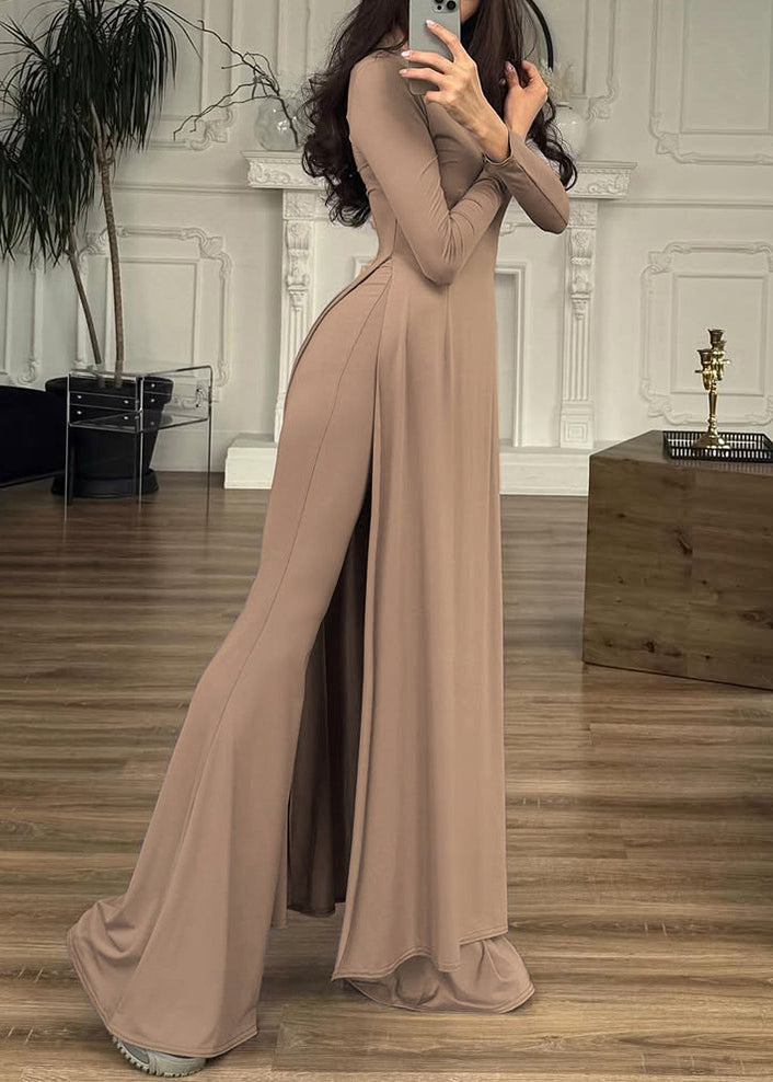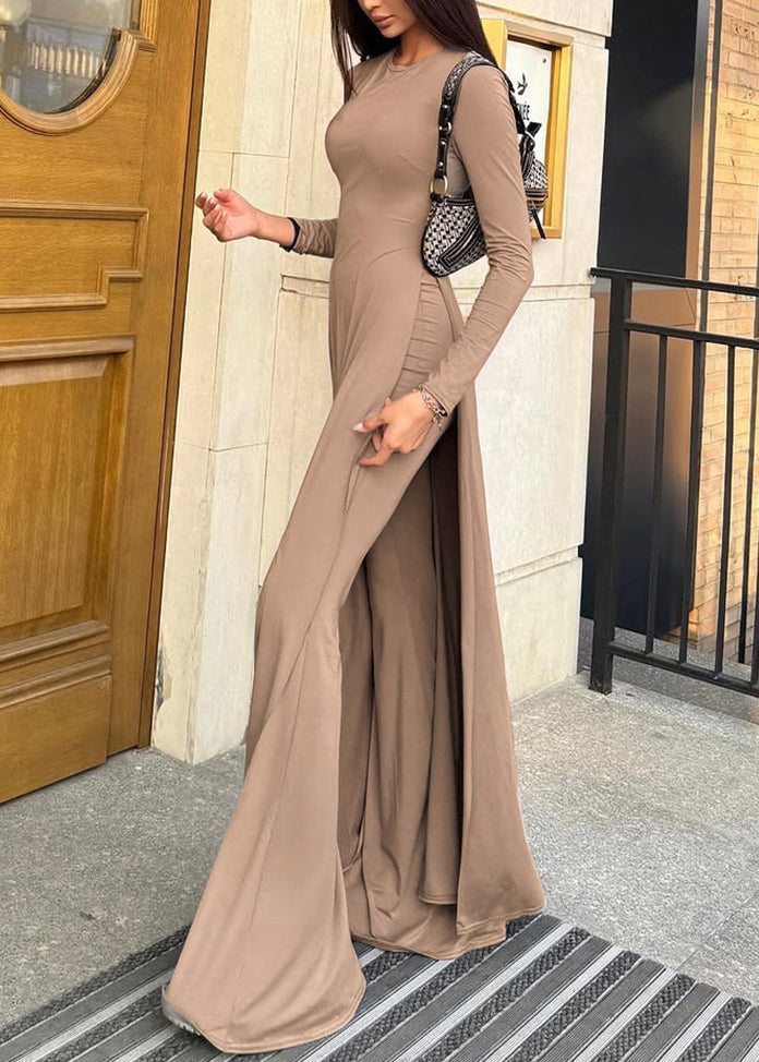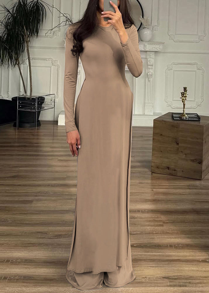 New Khaki O Neck Side Open Cotton Two-Piece Set Spring