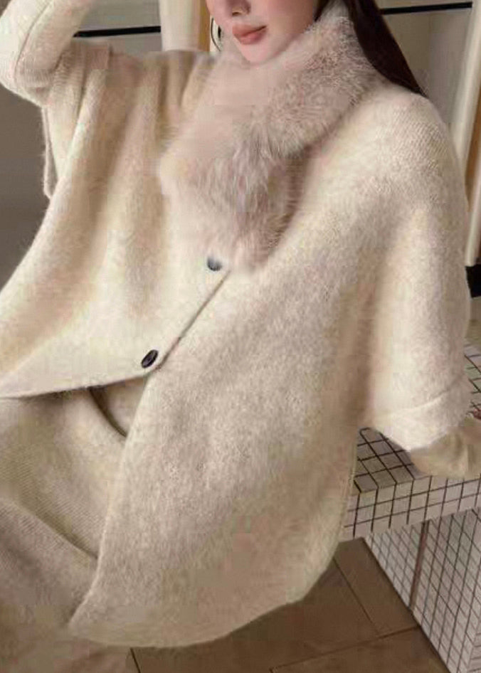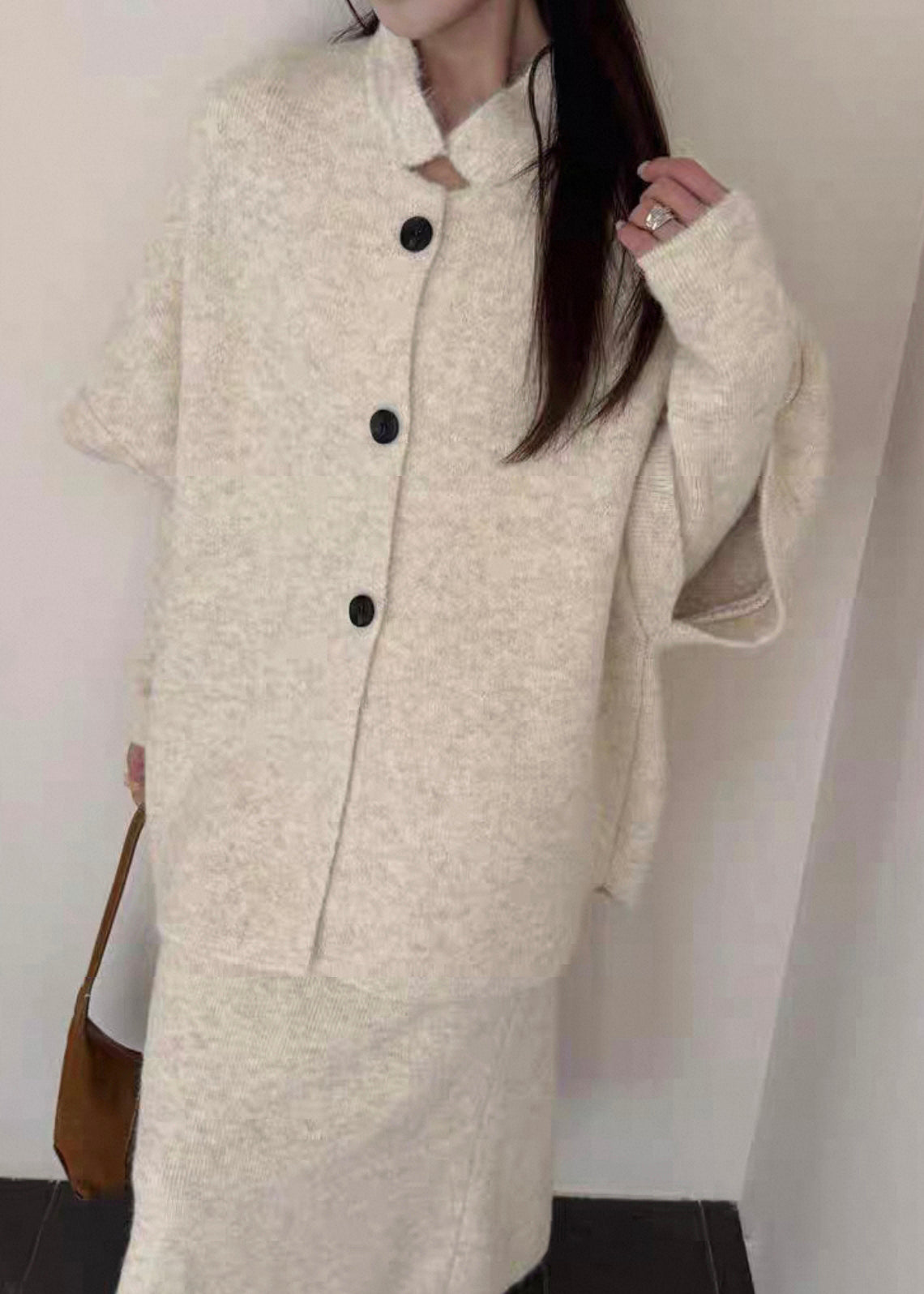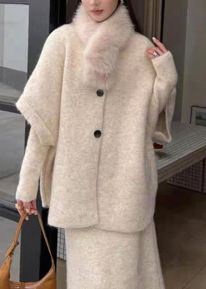 Original Coffee Fur Collar Solid Knit Three Piece Set Batwing Sleeve