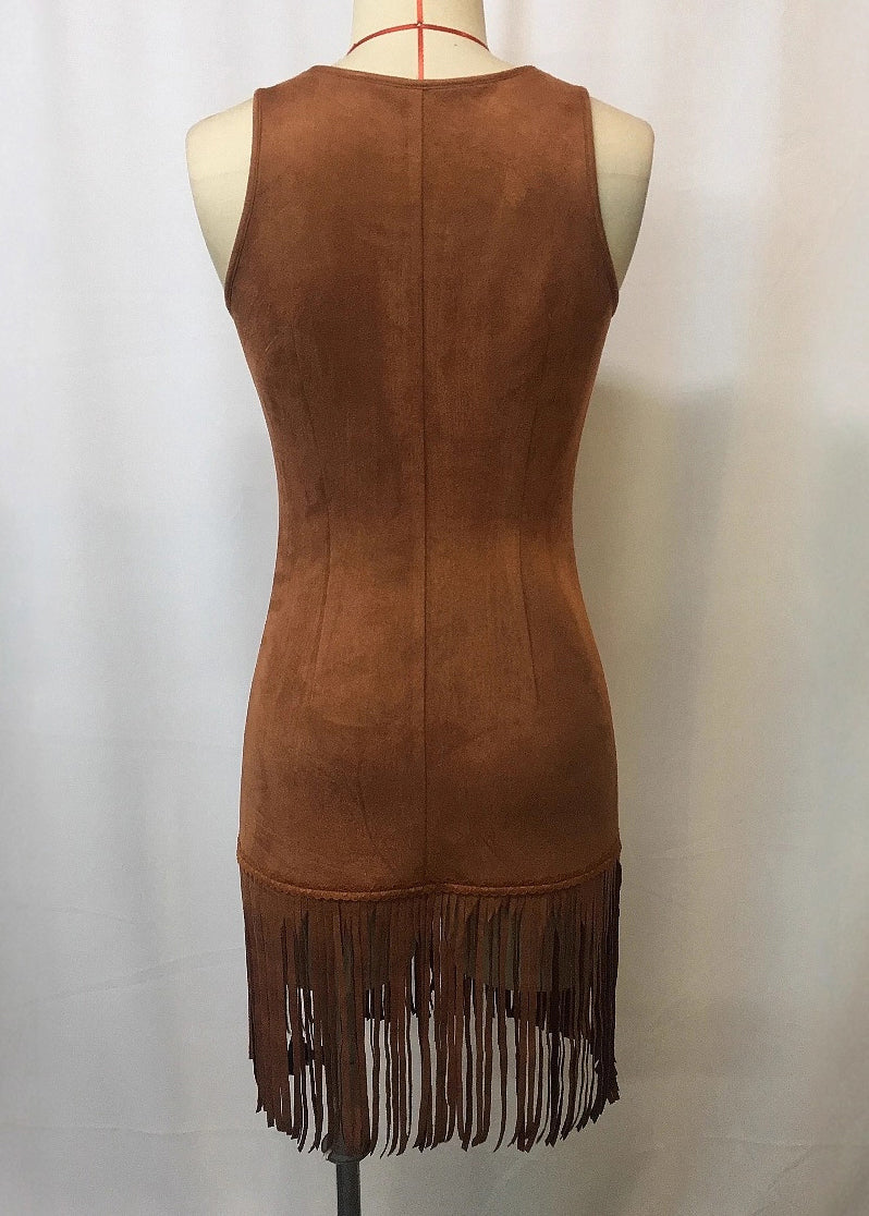 Slim Fit Brown Tasseled Button Solid Faux Suede Mini Dresses Sleeveless