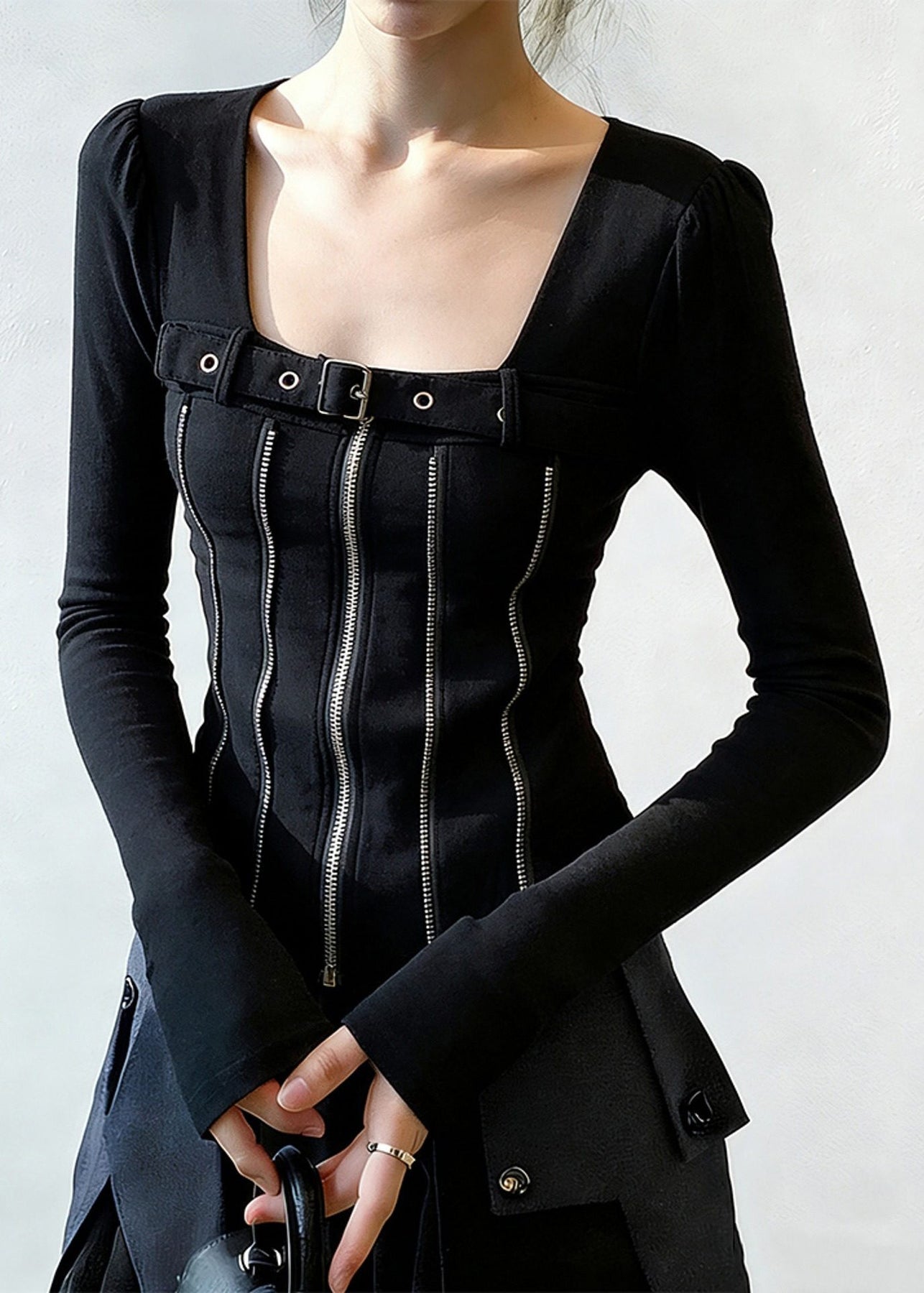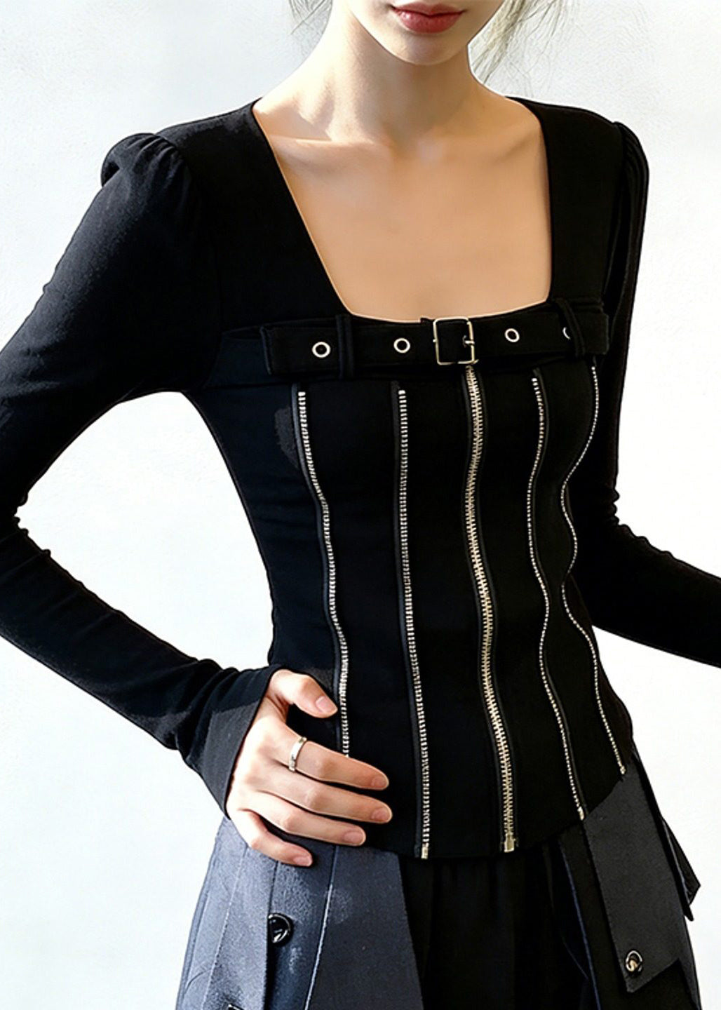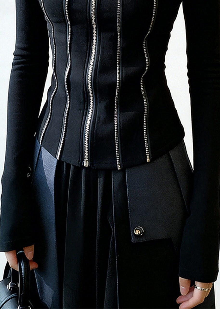 Black Zippered Patchwork Cotton T Shirt Square Collar Spring