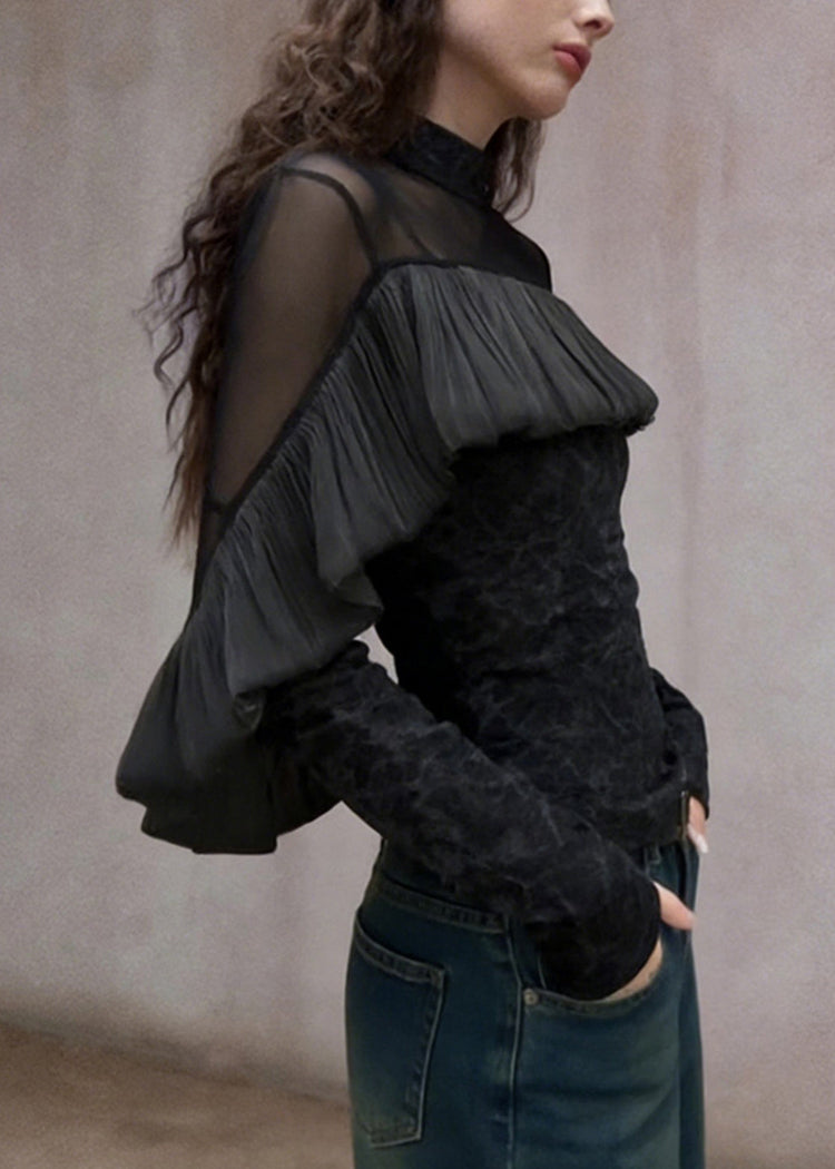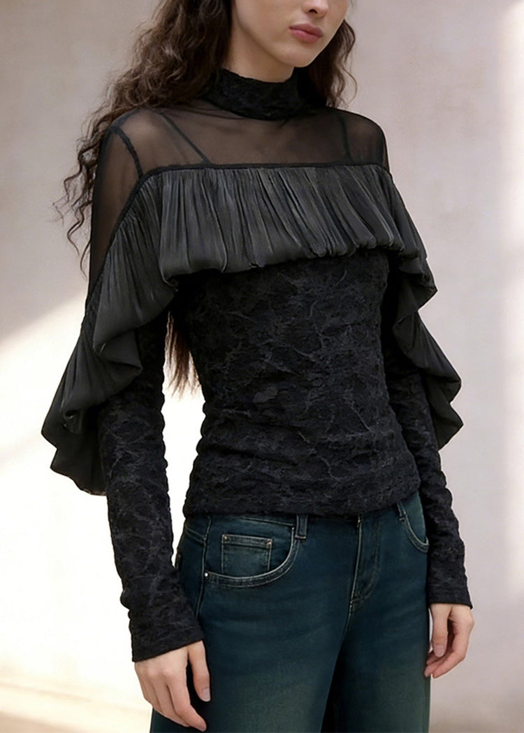 French Black Turtleneck Ruffled Tulle Patchwork T Shirt Spring