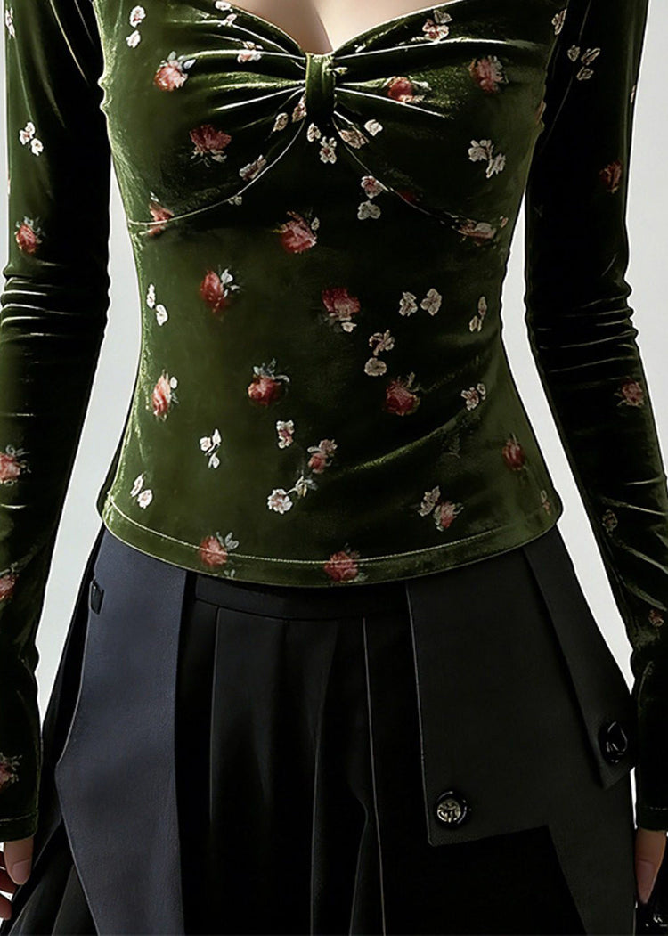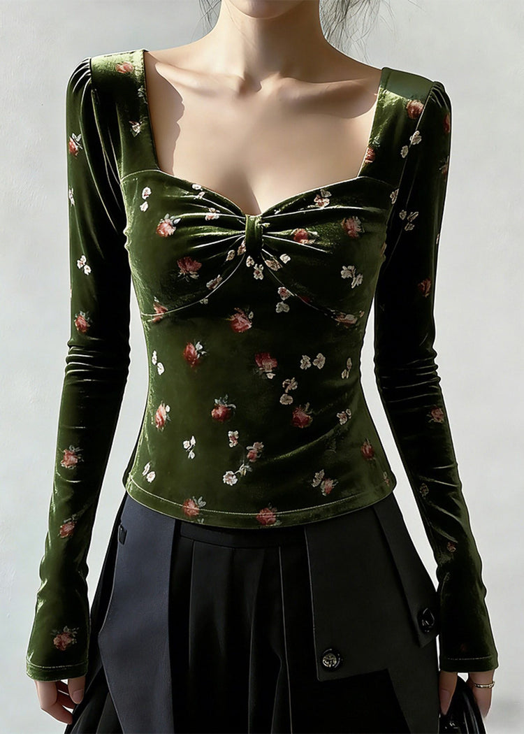 Slim Fit Green Square Collar Print Silk Velour T Shirt Spring