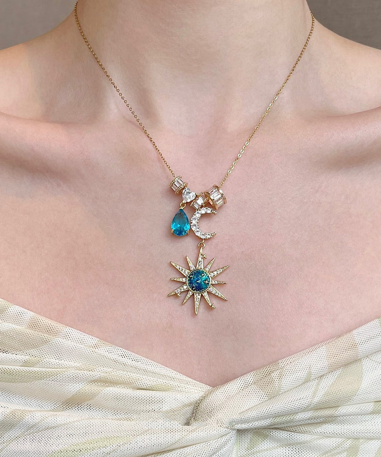 Chic Blue Sun Moon Zircon Alloy Pendant Necklace