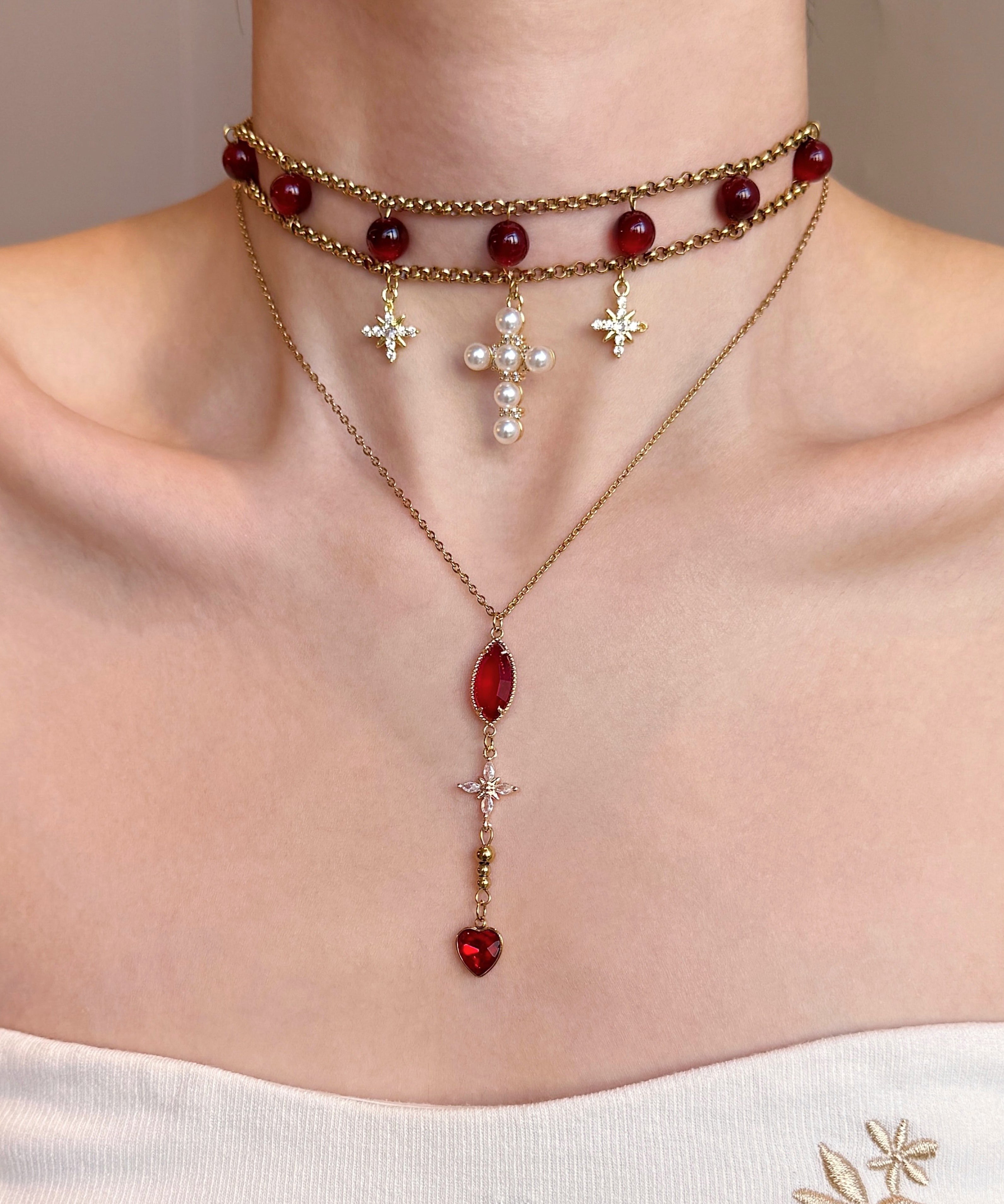 Elegant Red Cat's Eye Cross Layering Alloy Two Piece Set Pendant Necklace