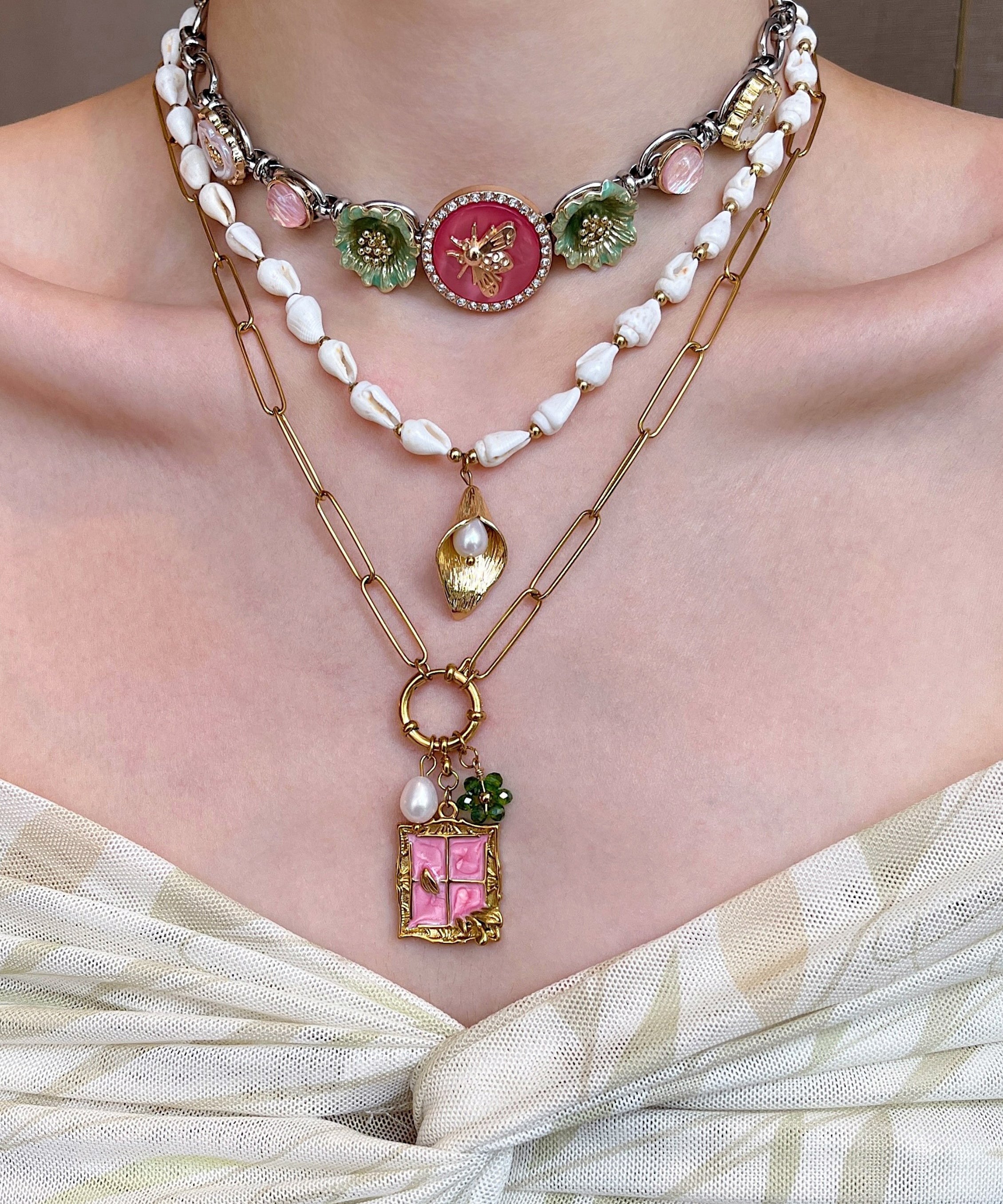 Elegant White Shell Floral Layering Alloy Three Piece Set Pendant Necklace
