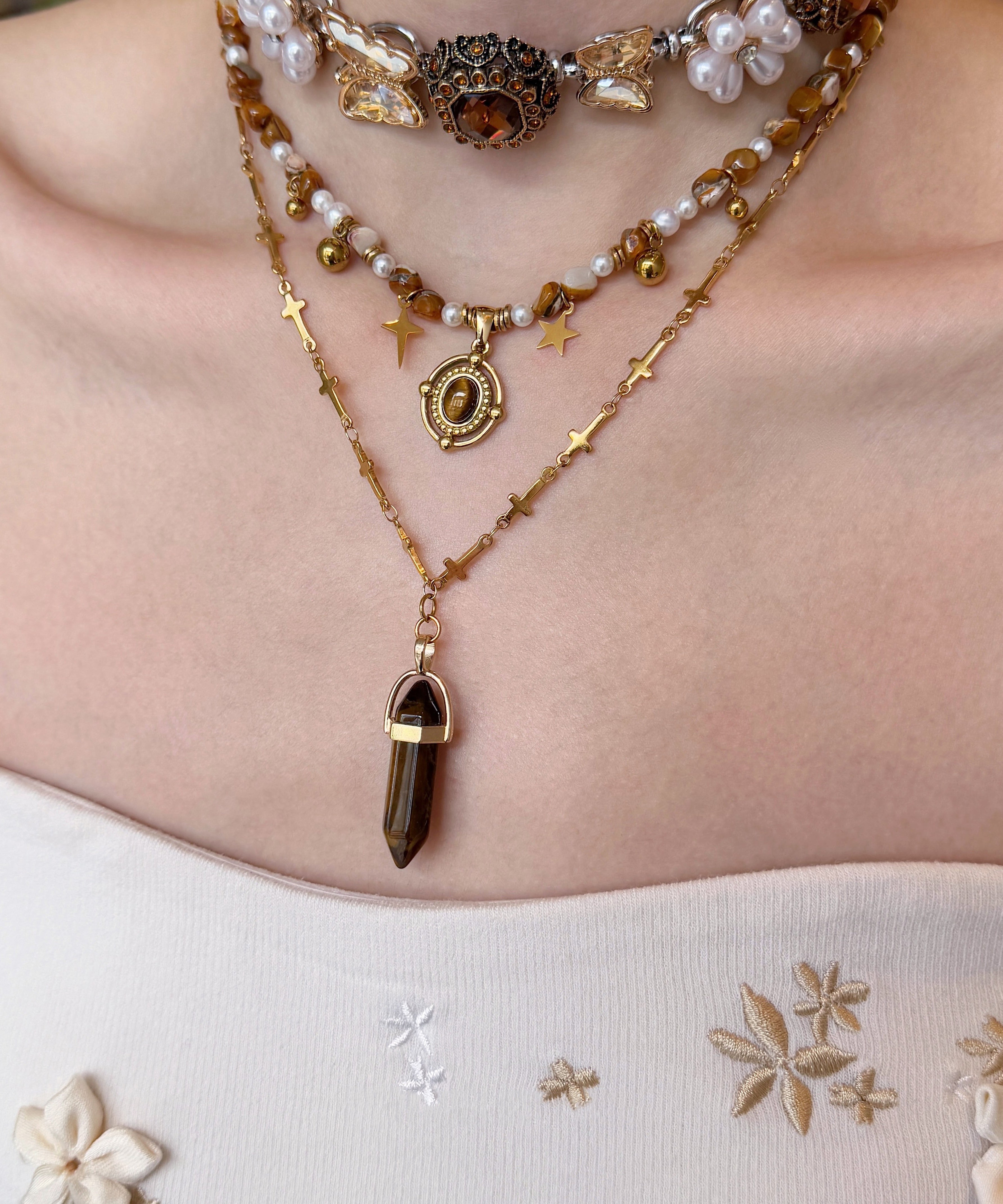 Floral Brown Tiger's Eye Pearl Butterfly Titanium Steel Three Piece Set Pendant Necklace