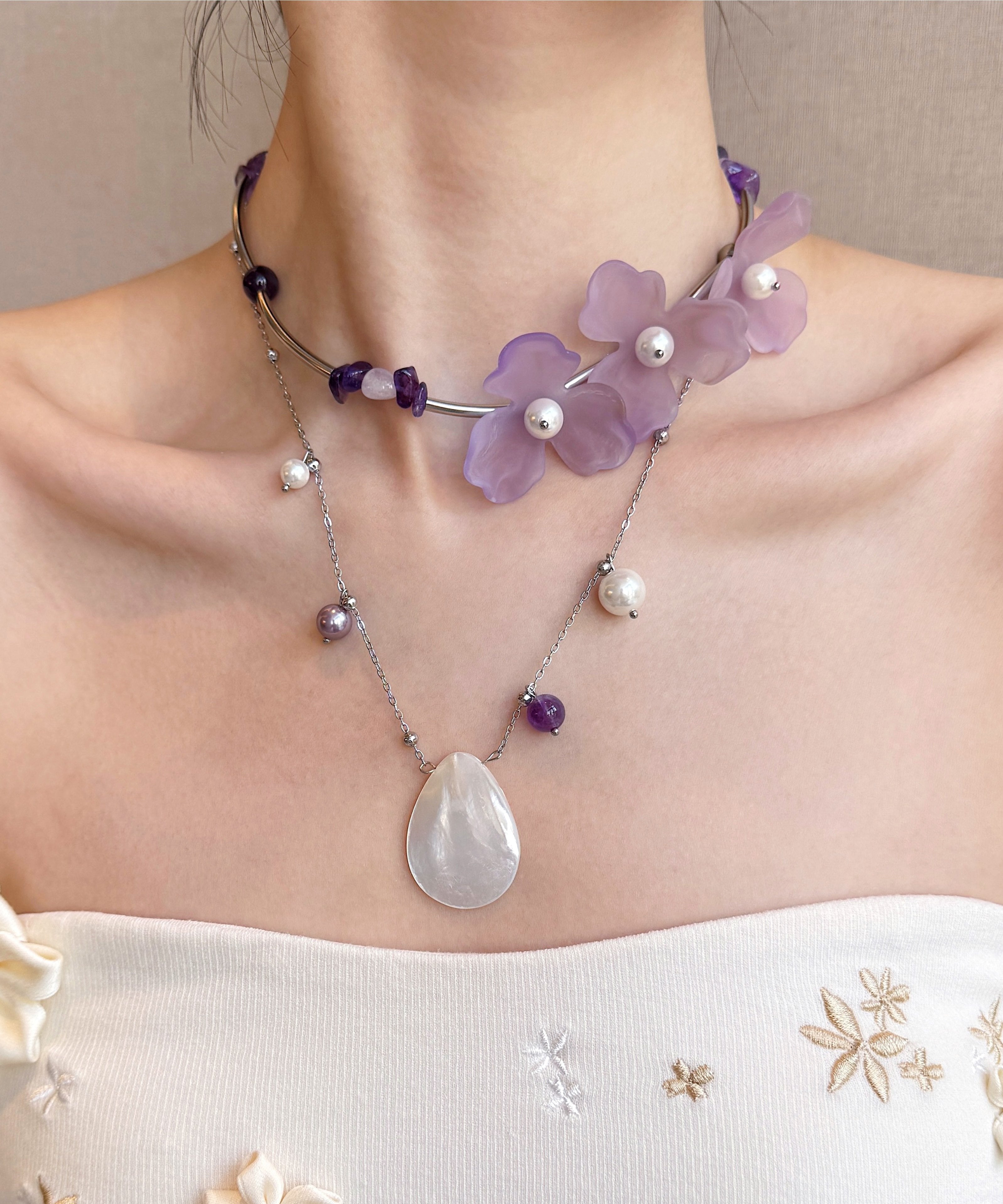 Floral Purple Pearl Shell Alloy Two Piece Set Pendant Necklace