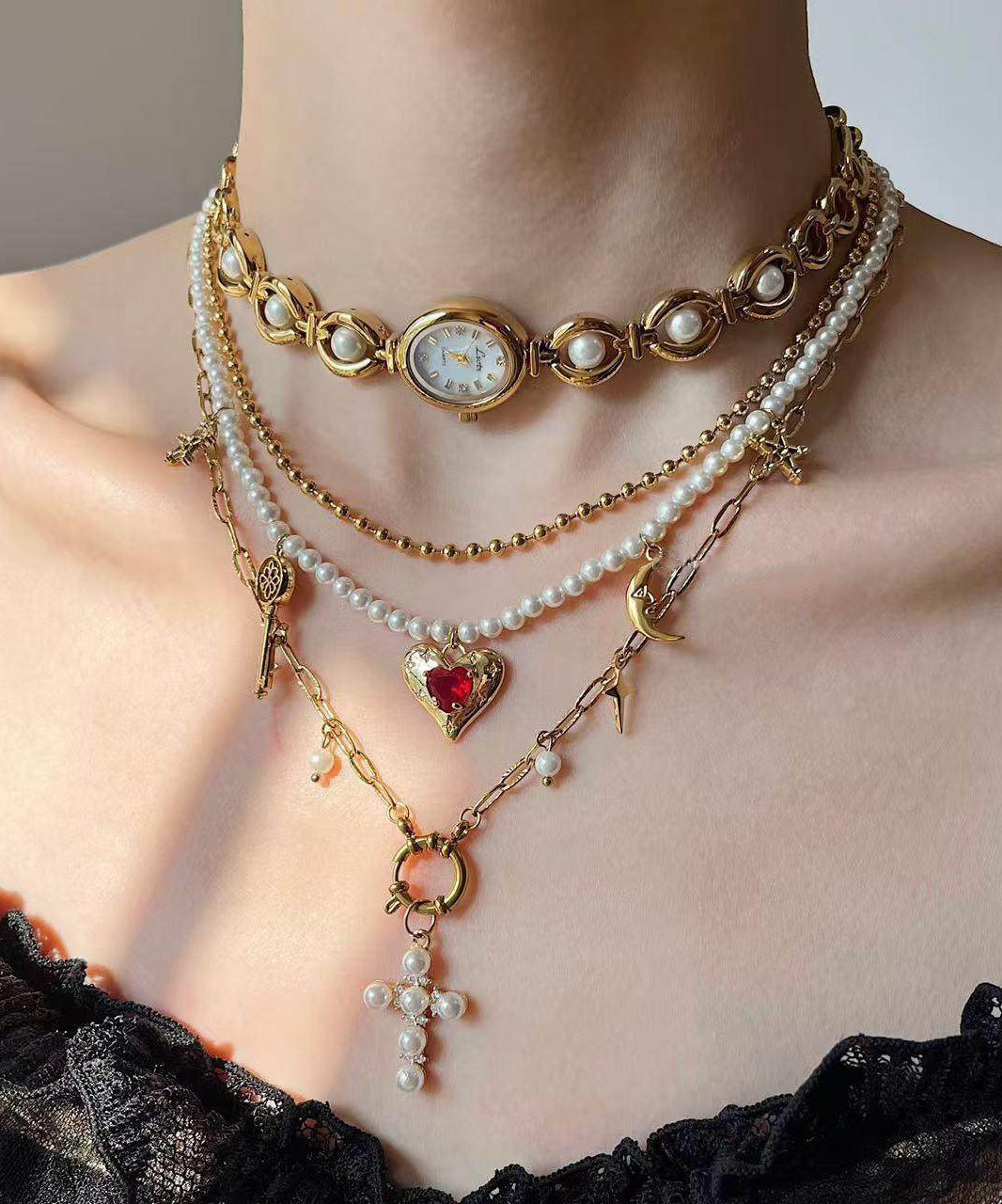 Stylish Gold Clock Love Pearl Layering Titanium Steel Two Piece Set Pendant Necklace