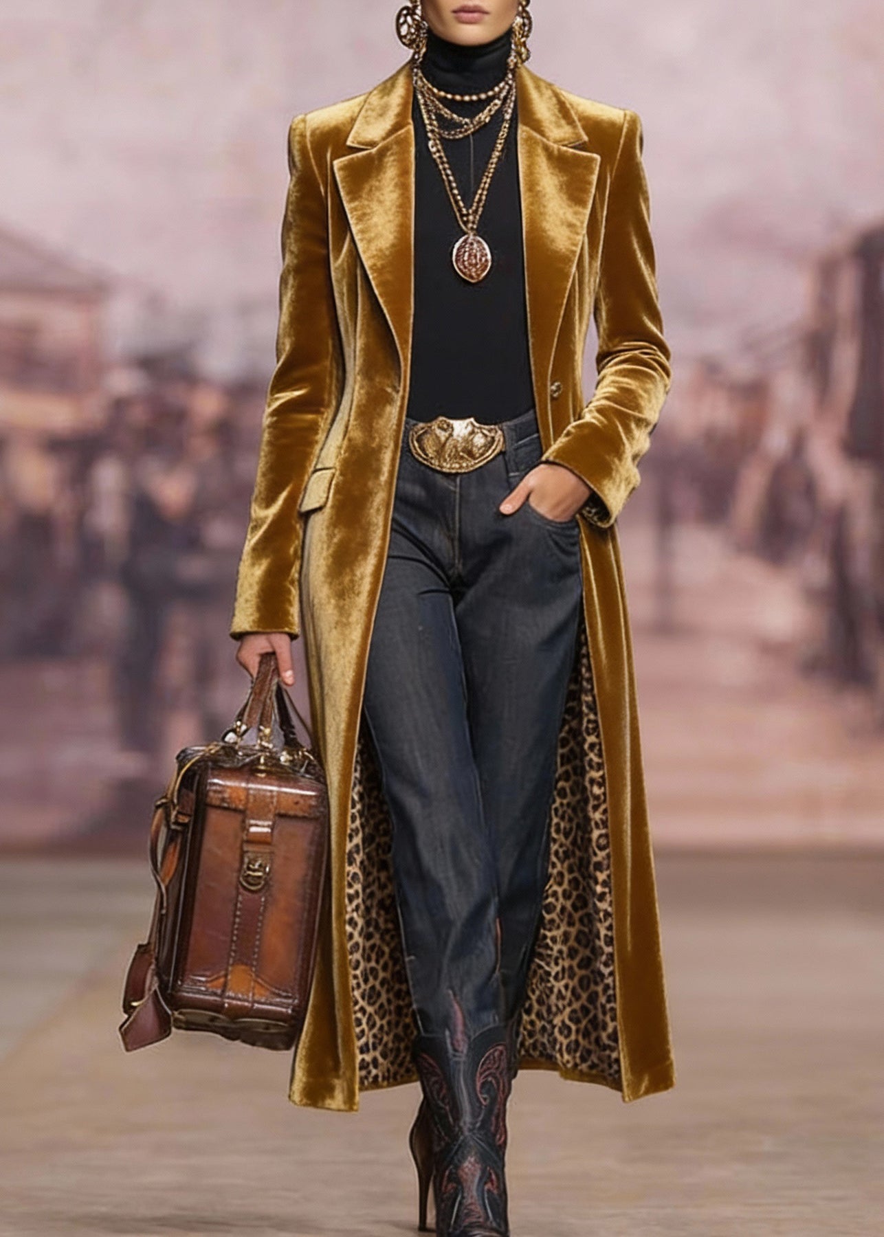 Chic Yellow Peter Pan Collar Pockets Velvet Trench Spring