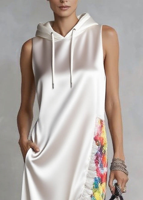 Natural White Ruffled Side Open Silk Hooded Dresses Sleeveless