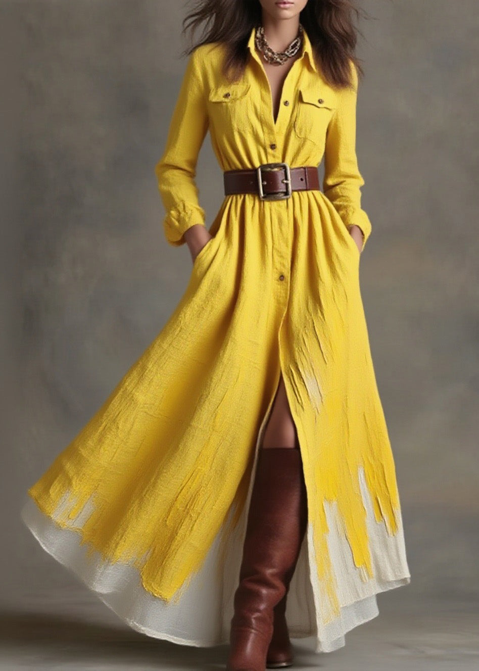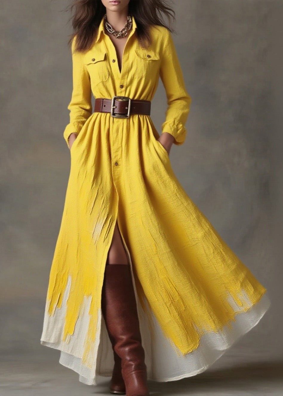 Women Yellow Peter Pan Collar Pockets Button Cotton Dress Spring