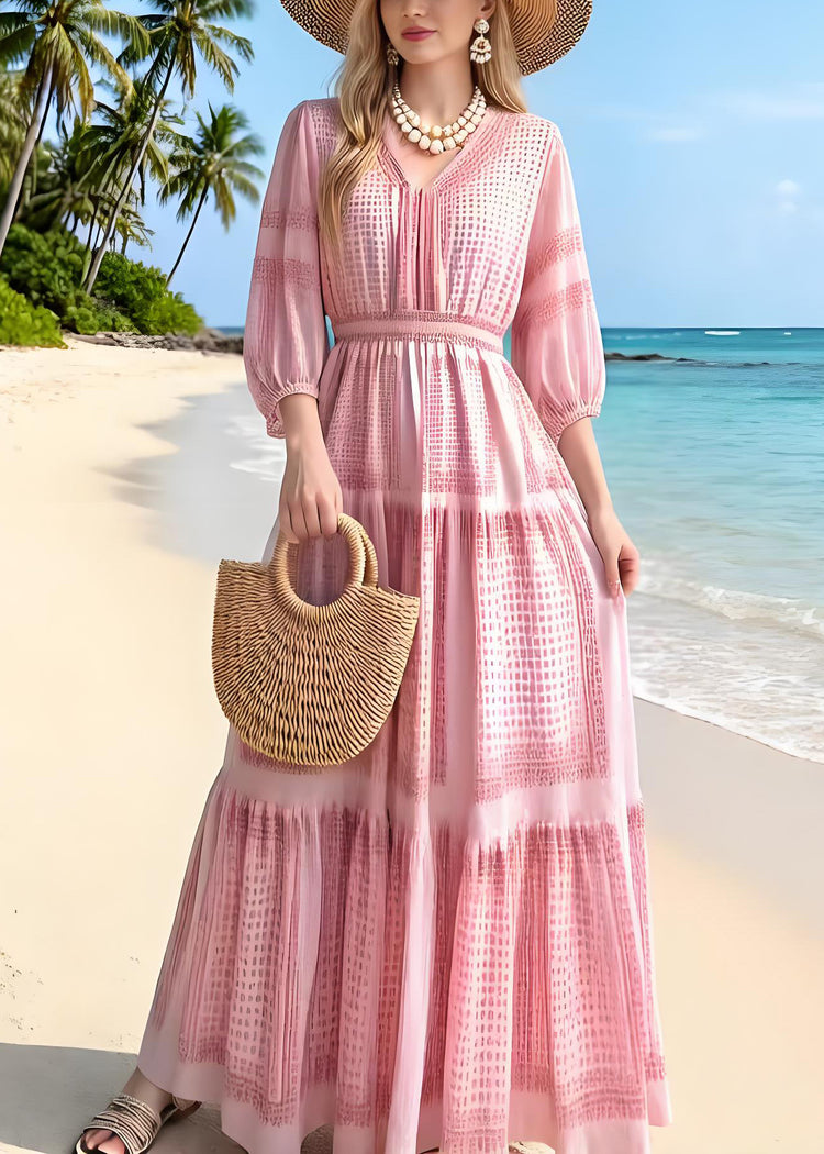 New Pink V Neck Print Wrinkled Chiffon Robe Dresses Summer