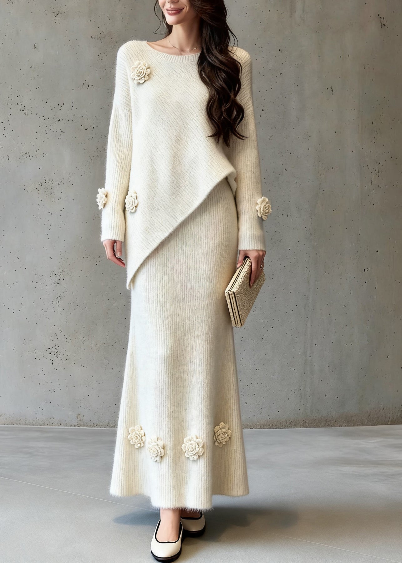 Natural Asymmetrical Floral Cotton Knit Sweaters And A Line Skirts Two-Piece Set Spring