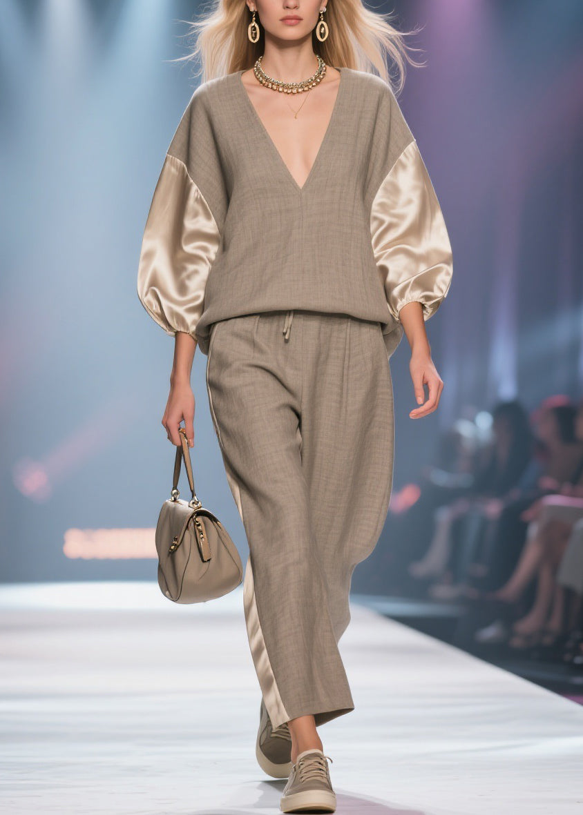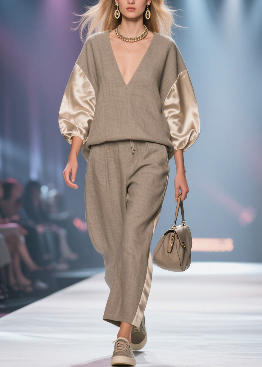 Grey Elastic Waist Silk Patchwork Two Piece Set V Neck Batwing Sleeve