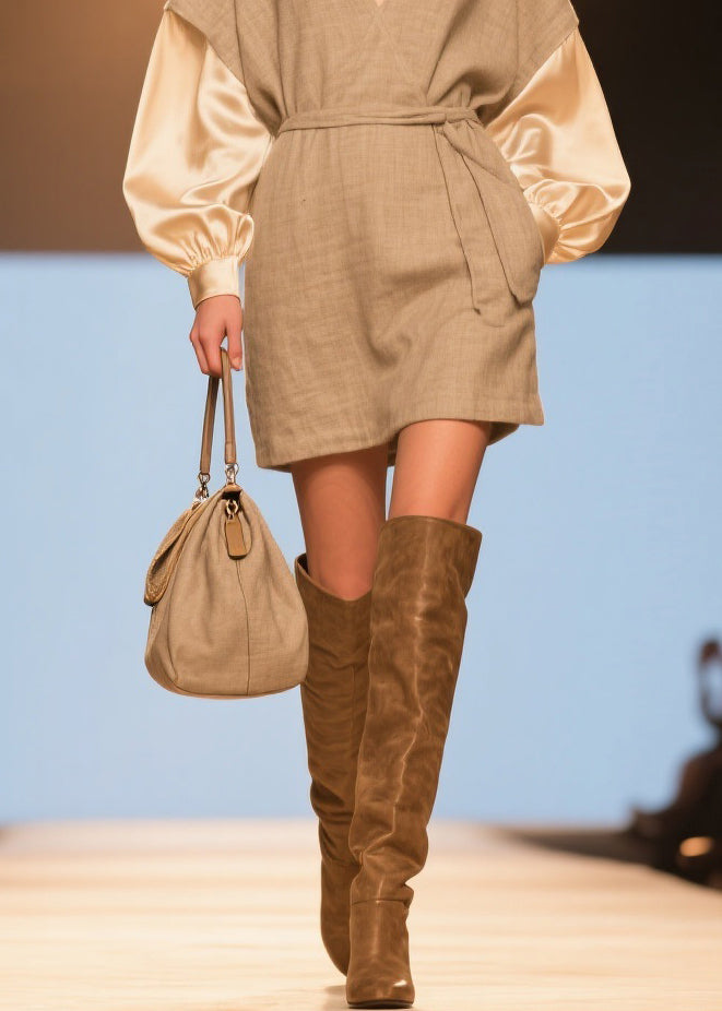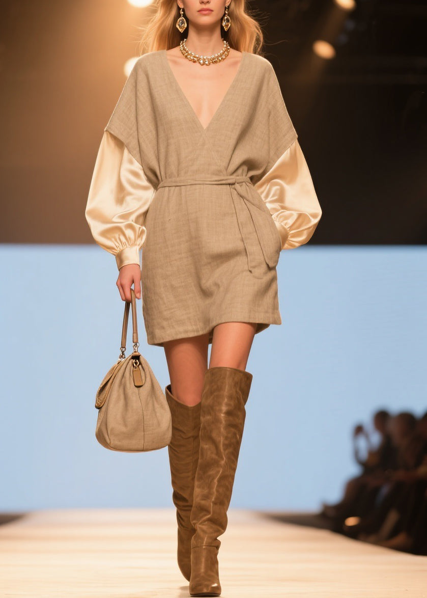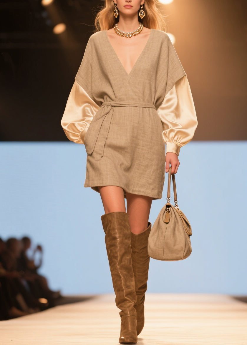 Original V Neck Tie Waist Silk Patchwork Linen Dresses Spring