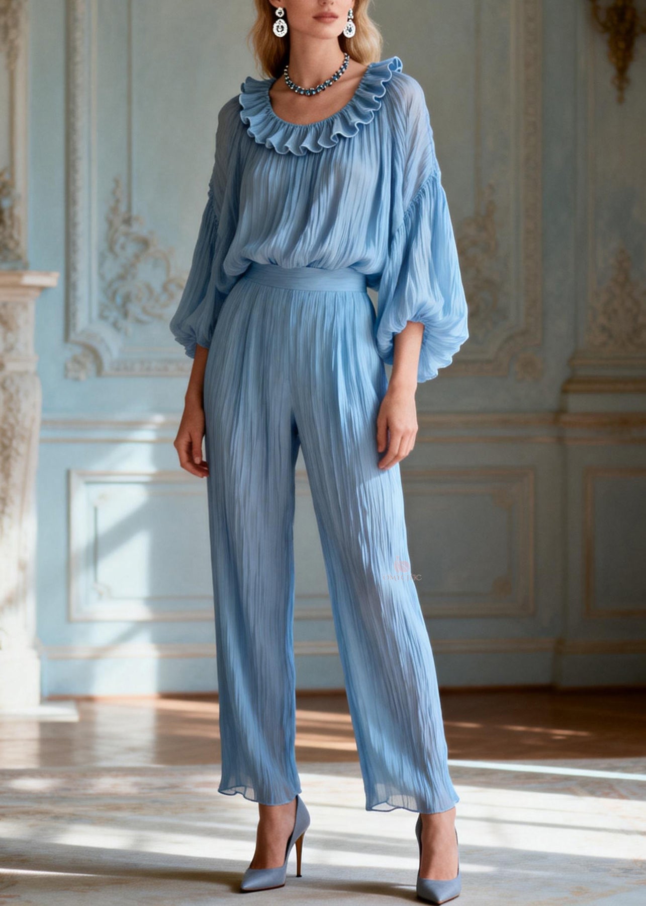 Italian Blue O-Neck Ruffled Patchwork Silk Two-Piece Set Summer