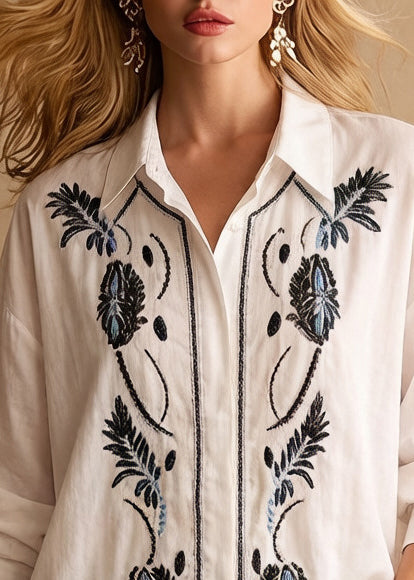 Boho White Embroidered Cotton Shirt Top Spring