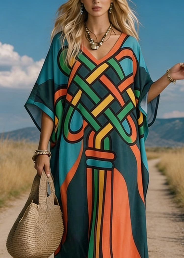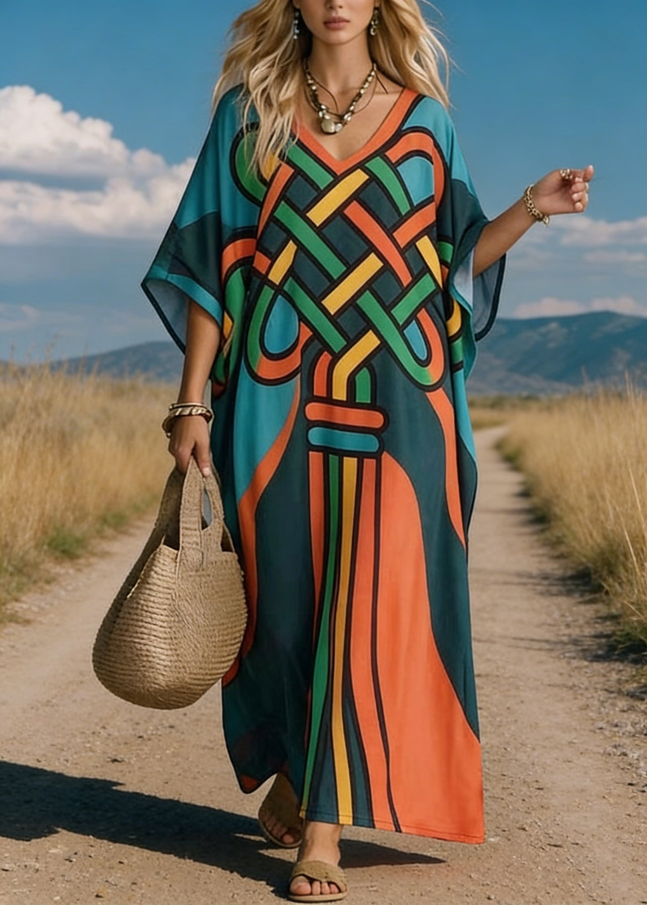 Loose V Neck Print Cotton Maxi Dresses Batwing Sleeve