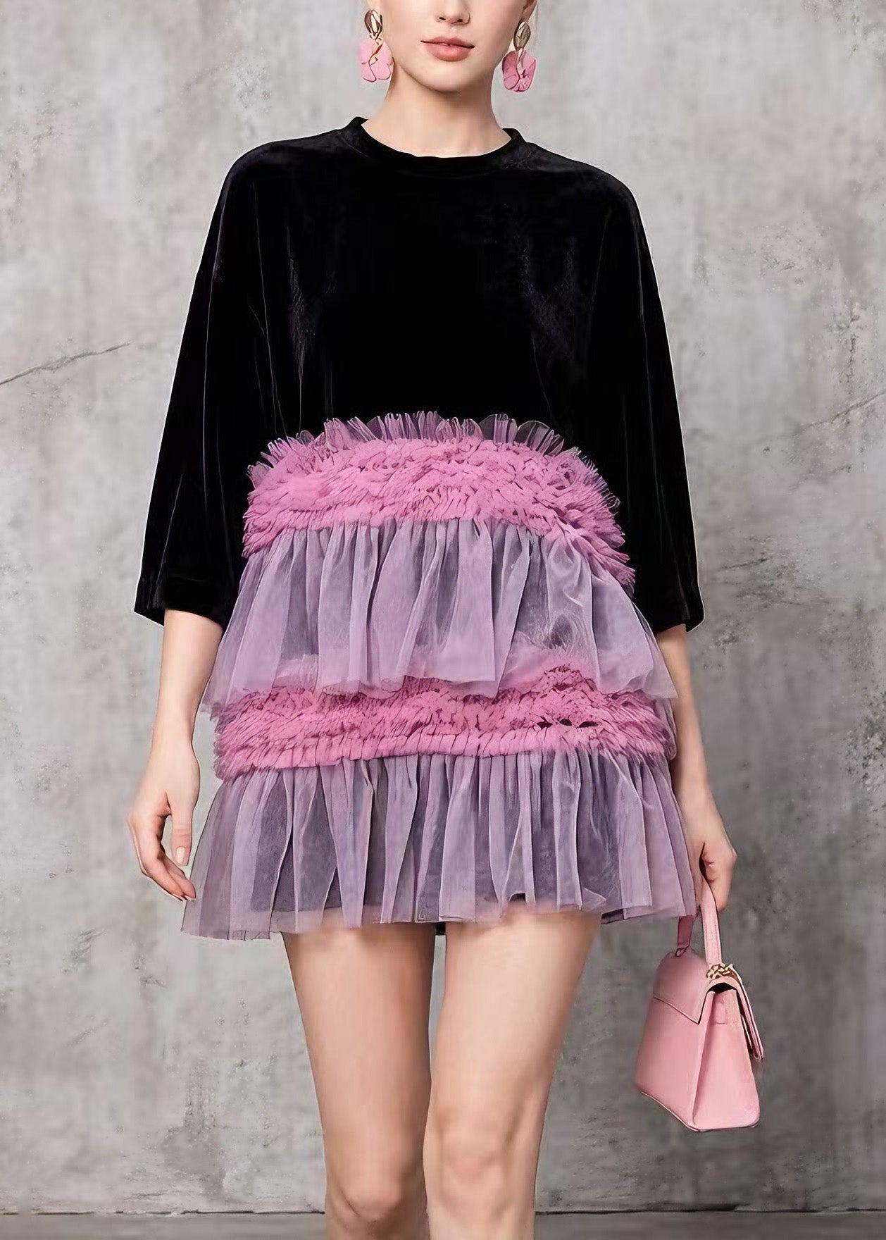 Style Black O Neck Ruffled Tulle Patchwork Velvet Mini Dress Summer