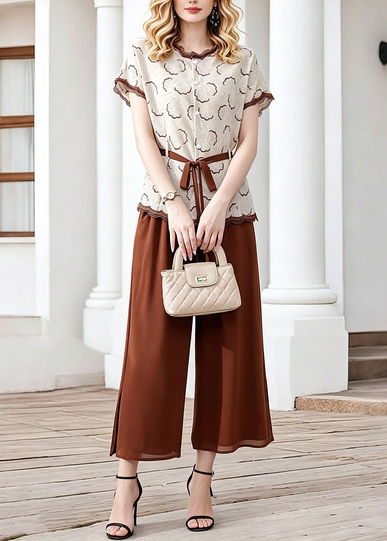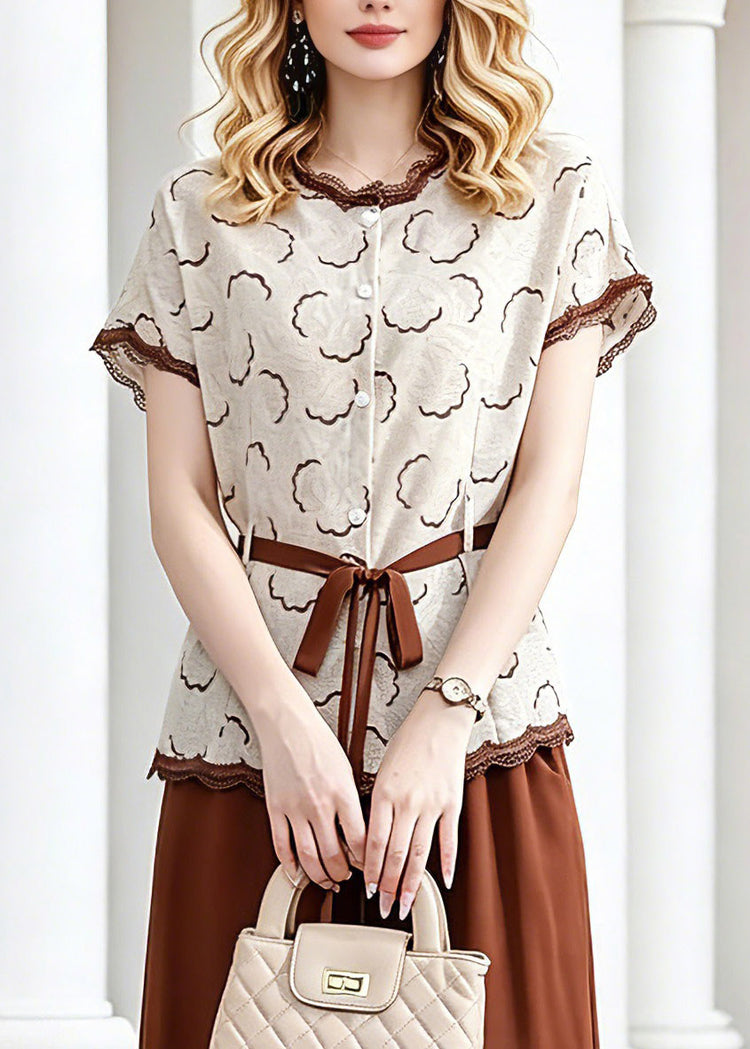 Elegant Coffee Tie Waist Chiffon Tops And Crop Pants Two Piece Set Short Sleeve