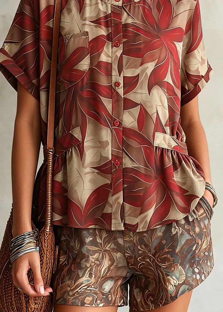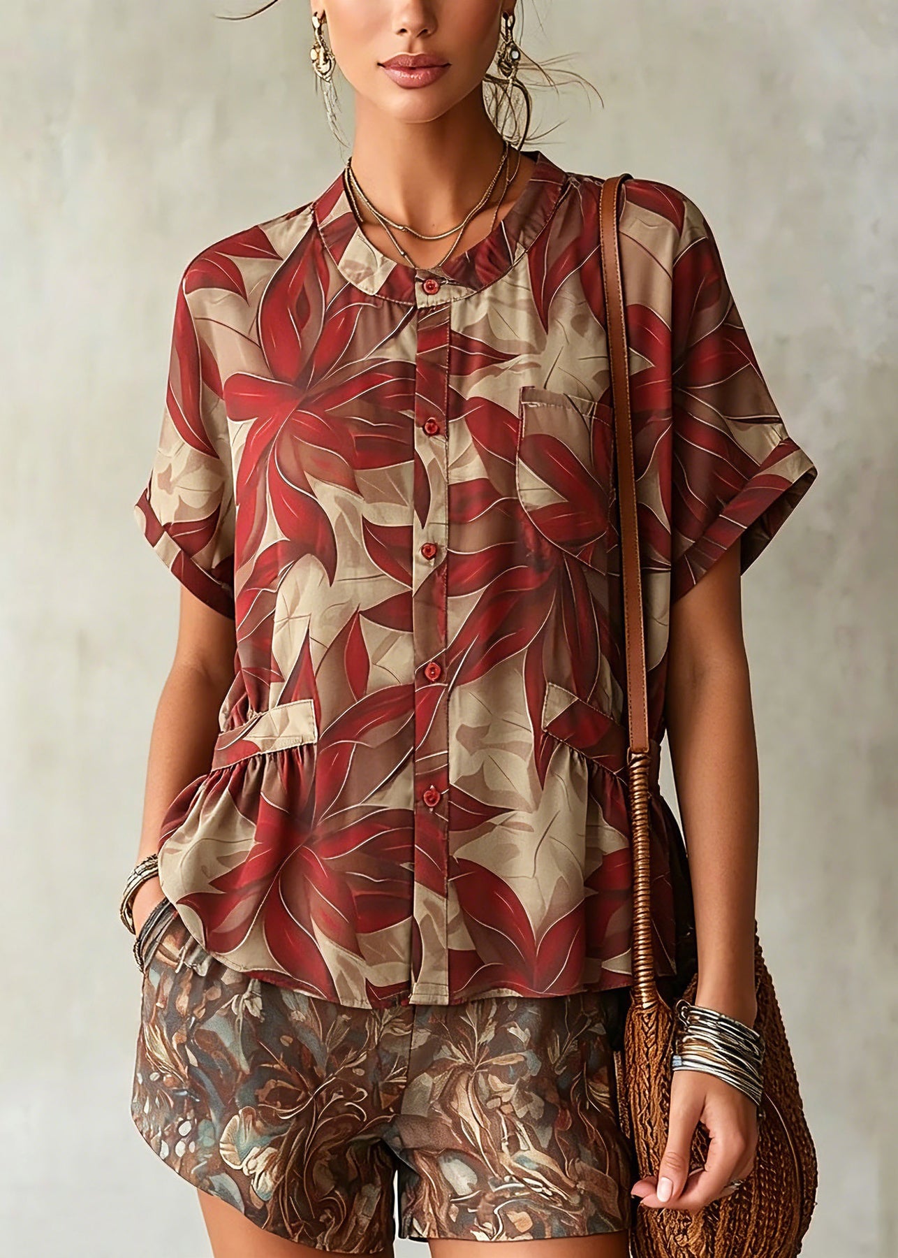 Loose Red O-Neck Print Shirt Chiffon Short Sleeve