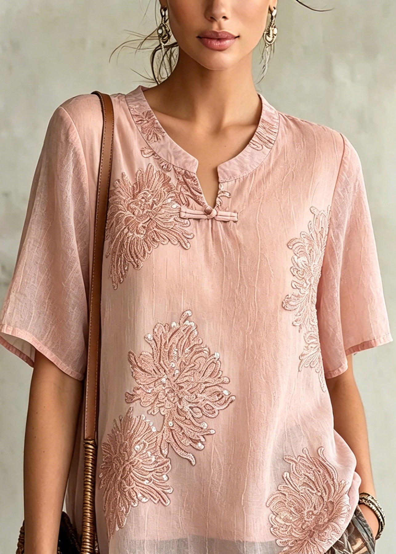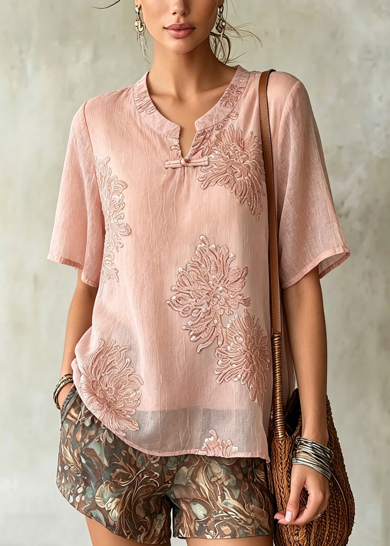 Women Pink O-Neck Patchwork Chiffon Shirt Summer