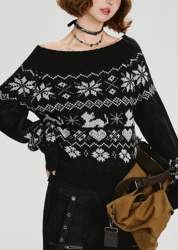 Casual Black Slash Neck Jacquard Knit Sweater Tops Spring