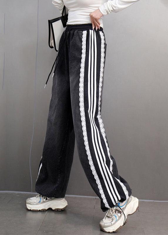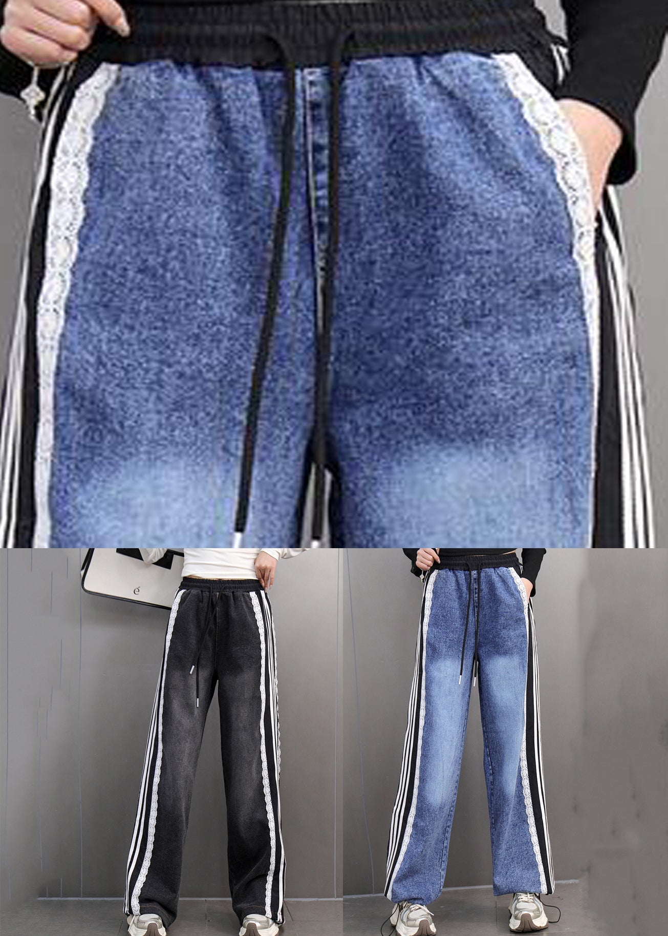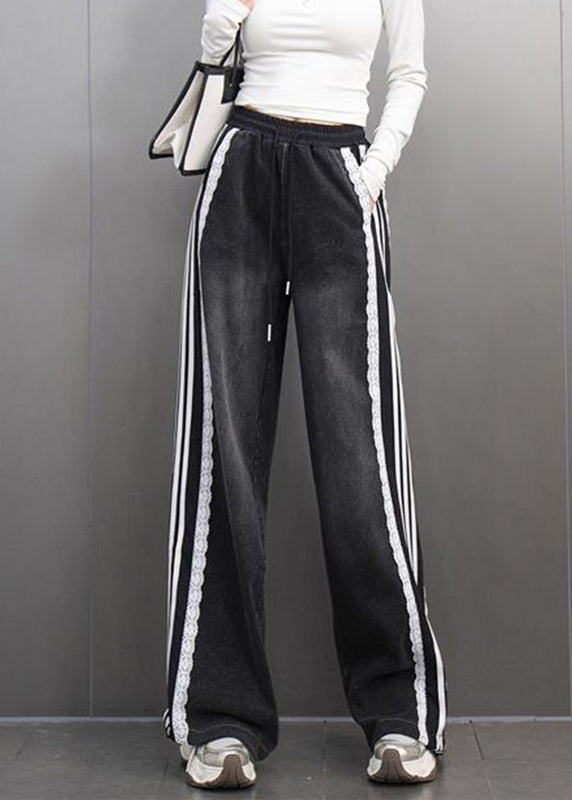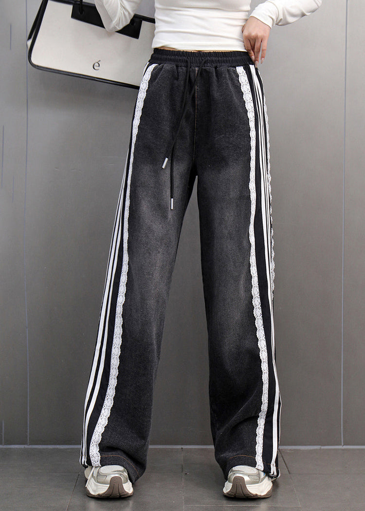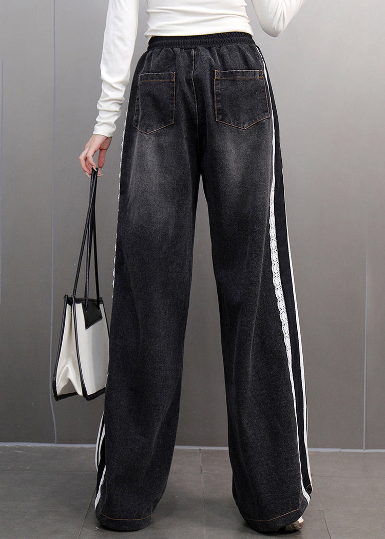 Black Elastic Waist Tie Waist Straight Denim Pants