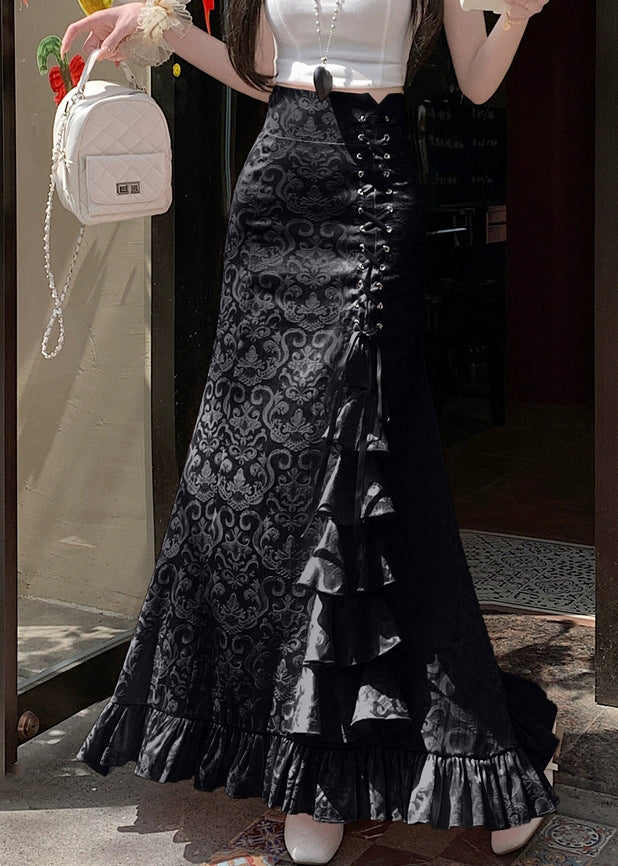 Black Lace Up Cotton Fishtail Skirts High Waist