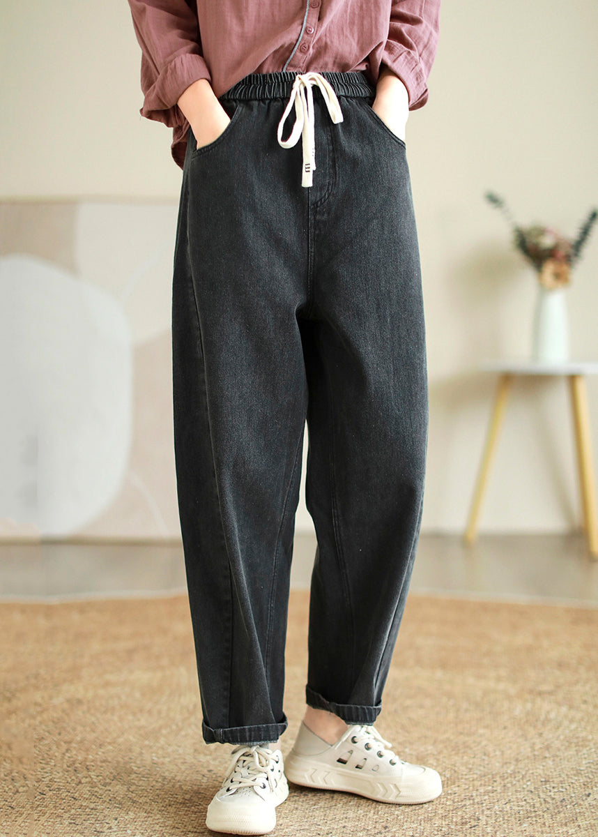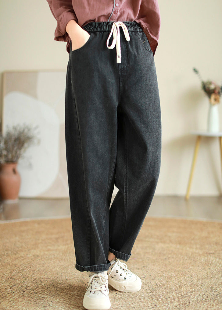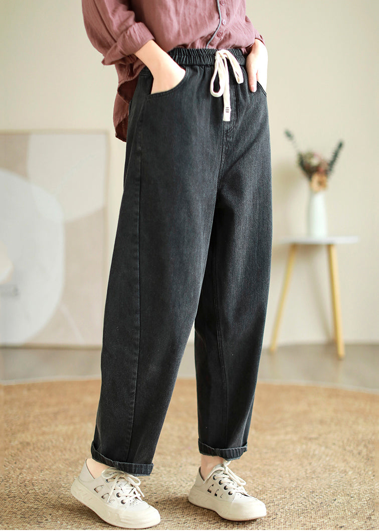 Black Lace Up Denim Crop Pants Elastic Waist Spring