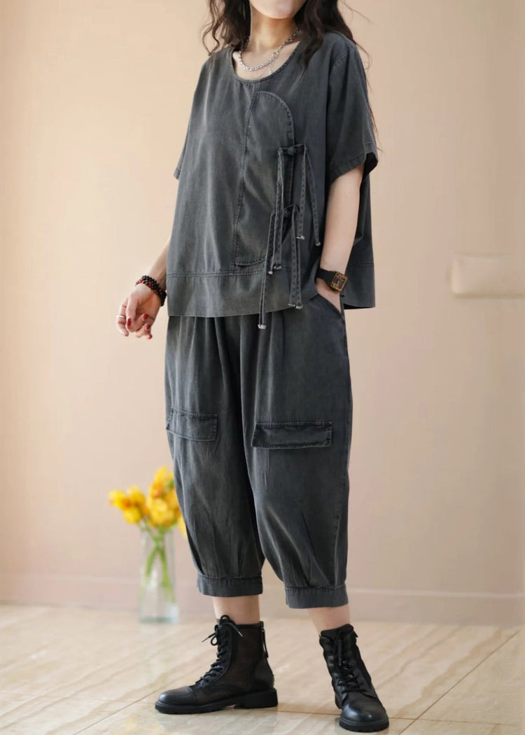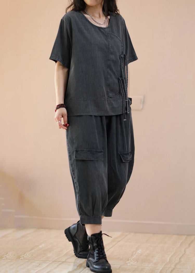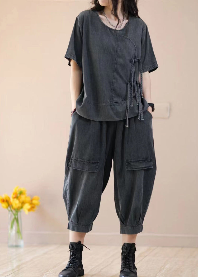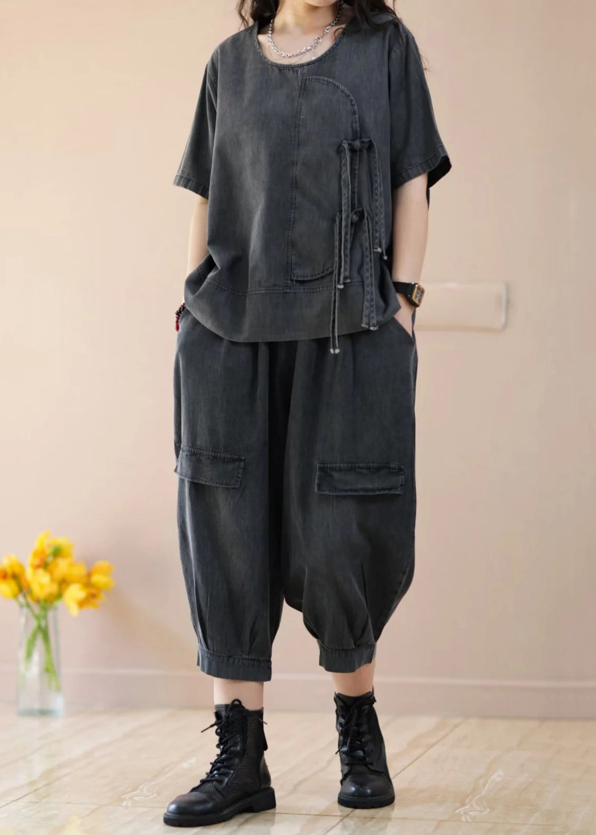 Black Lace Up Pockets Patchwork Denim Two Piece Suit Set Summer