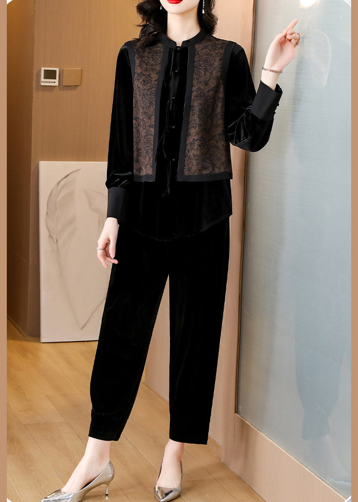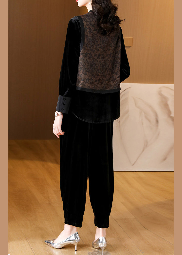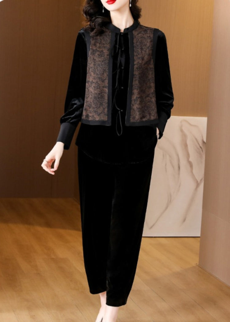 Black O-Neck Print Silk Velour Shirts And Harem Pants Two Pieces Set Fall